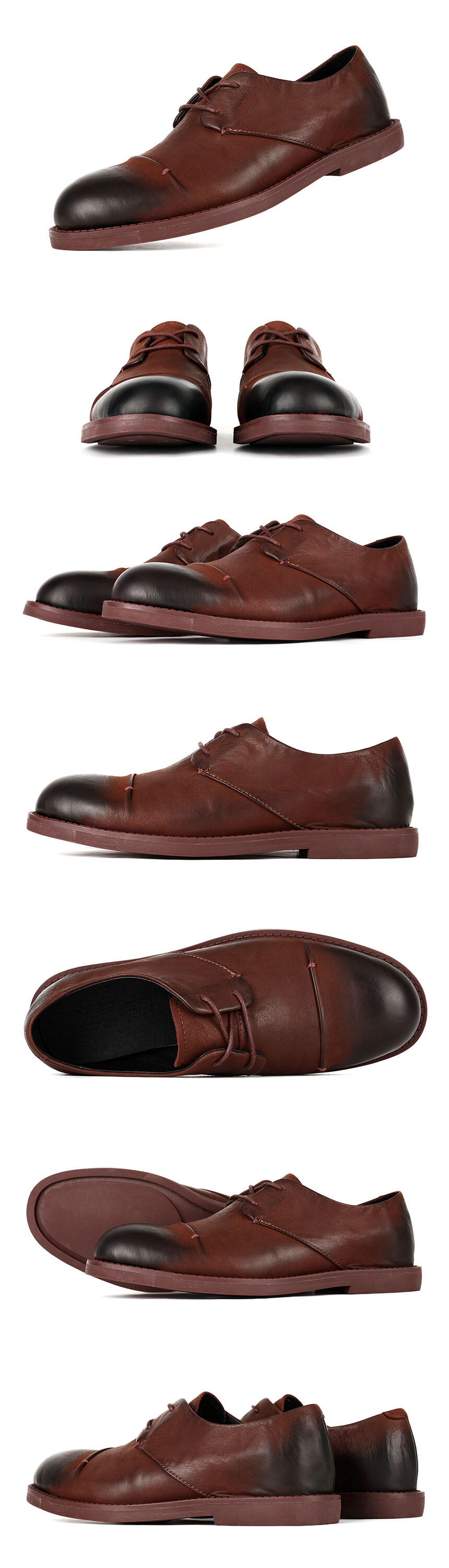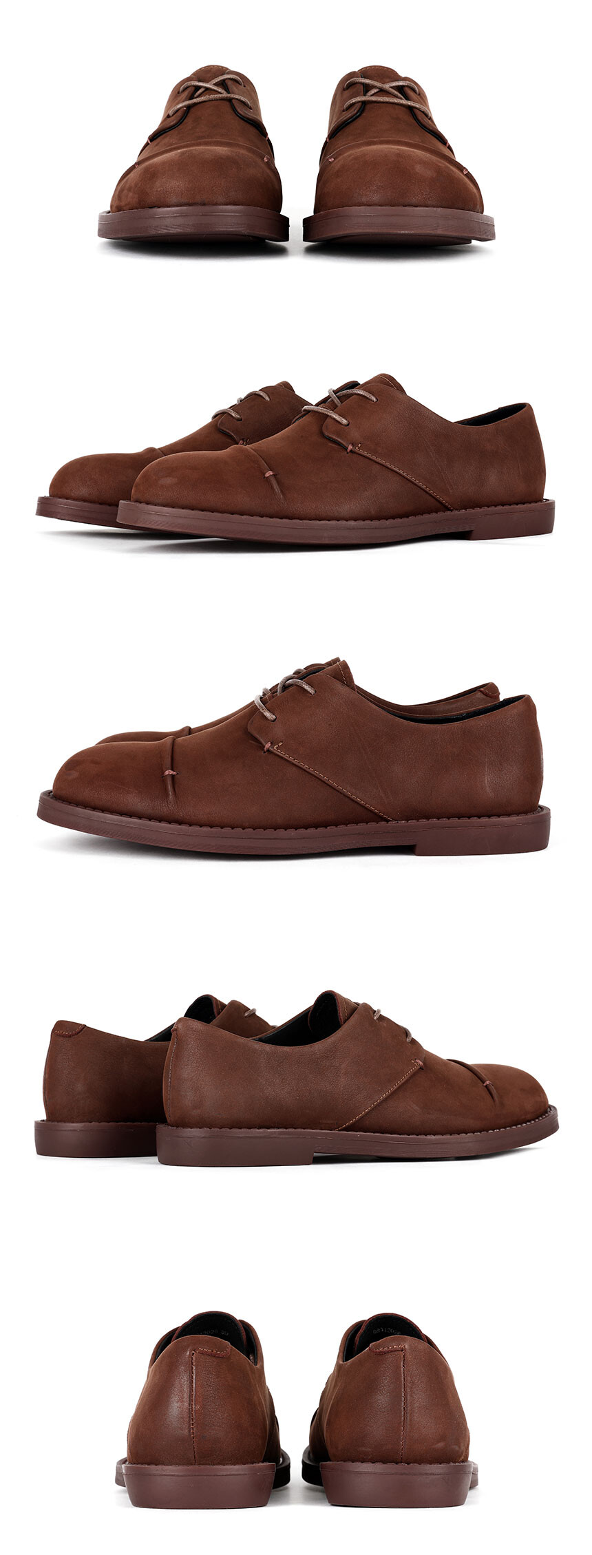 뭉툭하고 둥그스름한 복고풍의 구두를 현대적인 느낌으로 재해석한 정장화, 범퍼(BUMPER). 스트레이트 토캡 느낌의 발등 주름이 포인트가 되어주기 때문에 깔끔한 정장이나 댄디한 차림에 잘 어울리는 더비 슈즈입니다.