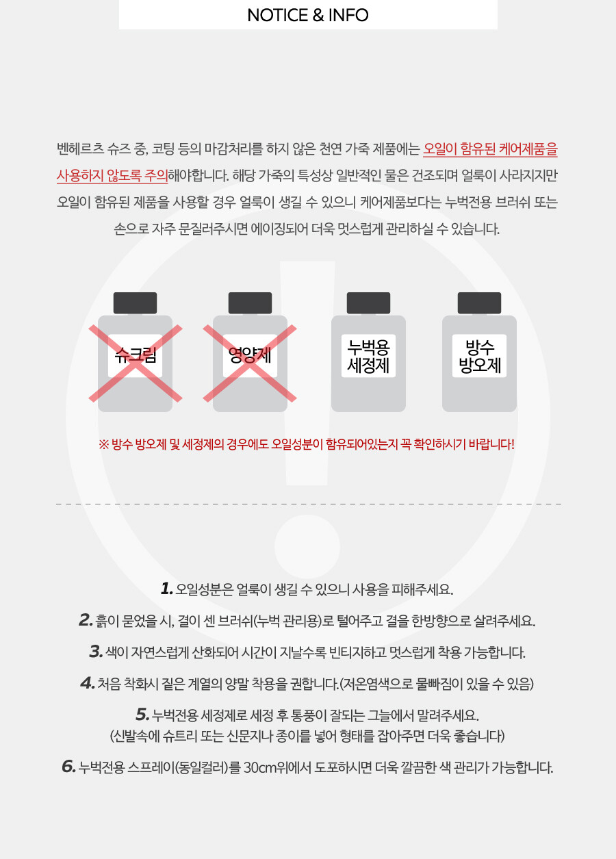 5. 누벅 혹은 스웨이드 제품은 전용 케어상품으로 관리해주십시오. (오일 함유 제품 사용금지)
