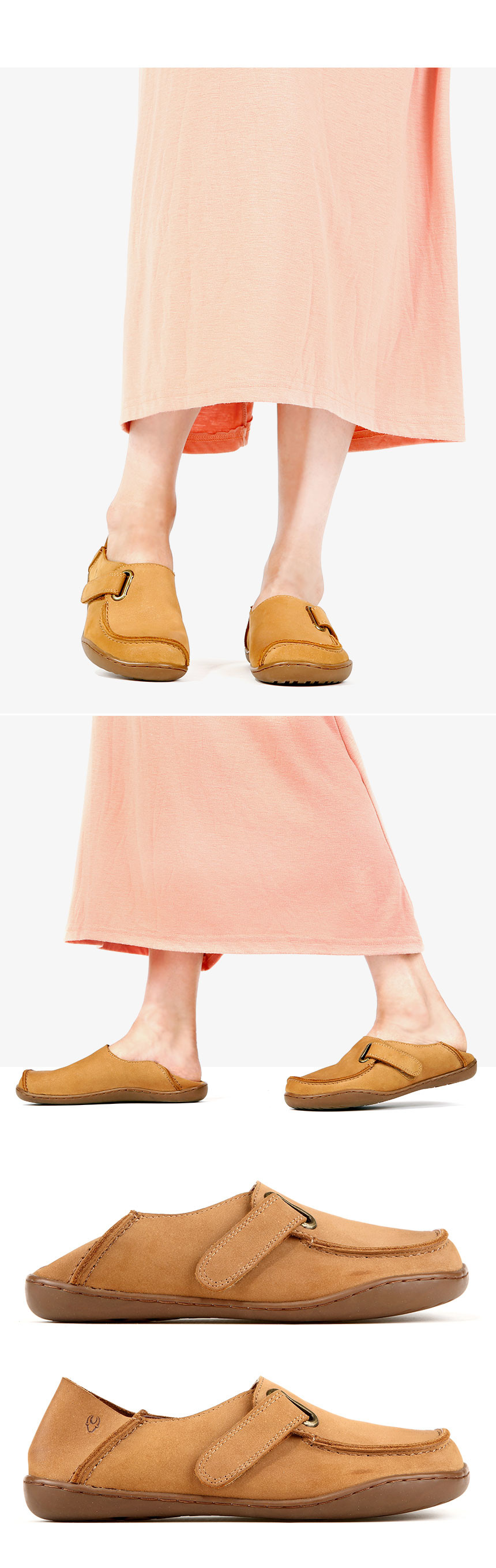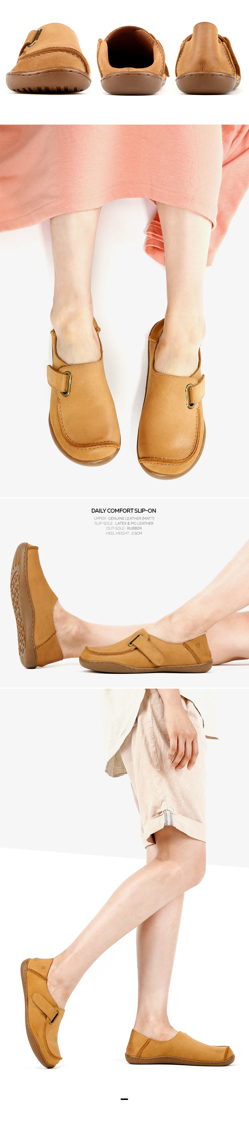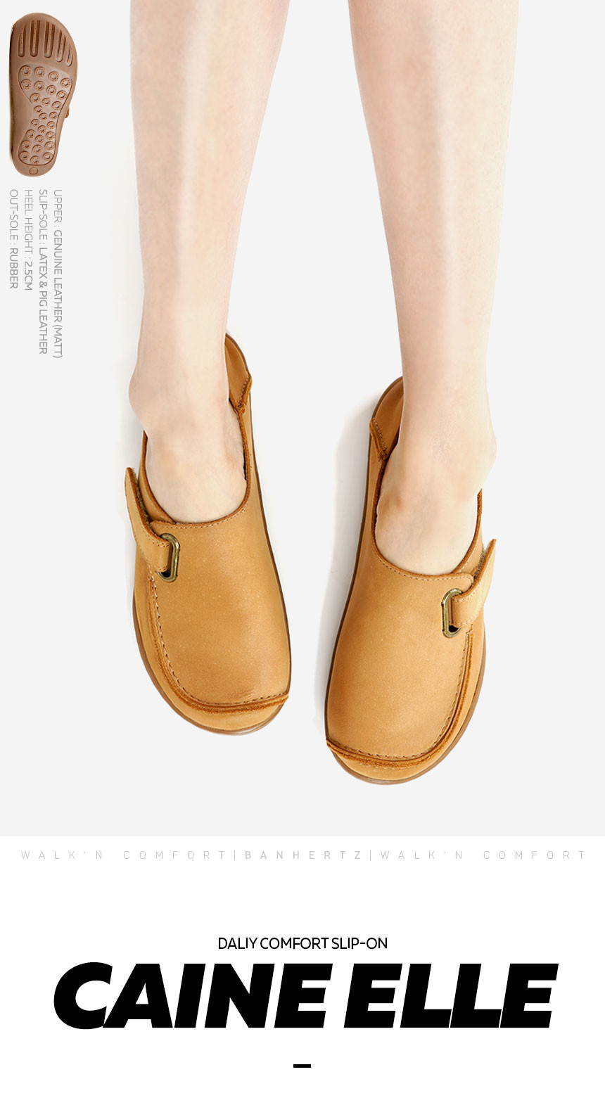 여유있는 앞코와 볼을 가진 슬립온으로 발가락이 모이지 않아 공기 순환이 원활하며 안정감 있는 걸음걸이를 선사합니다. 부드러운 매트 카멜 컬러의 소가죽과 원한다면 접어신을 수 있는 바부슈로 설계되어 블로퍼처럼 편히 신을 수 있어 것은 덤이죠!