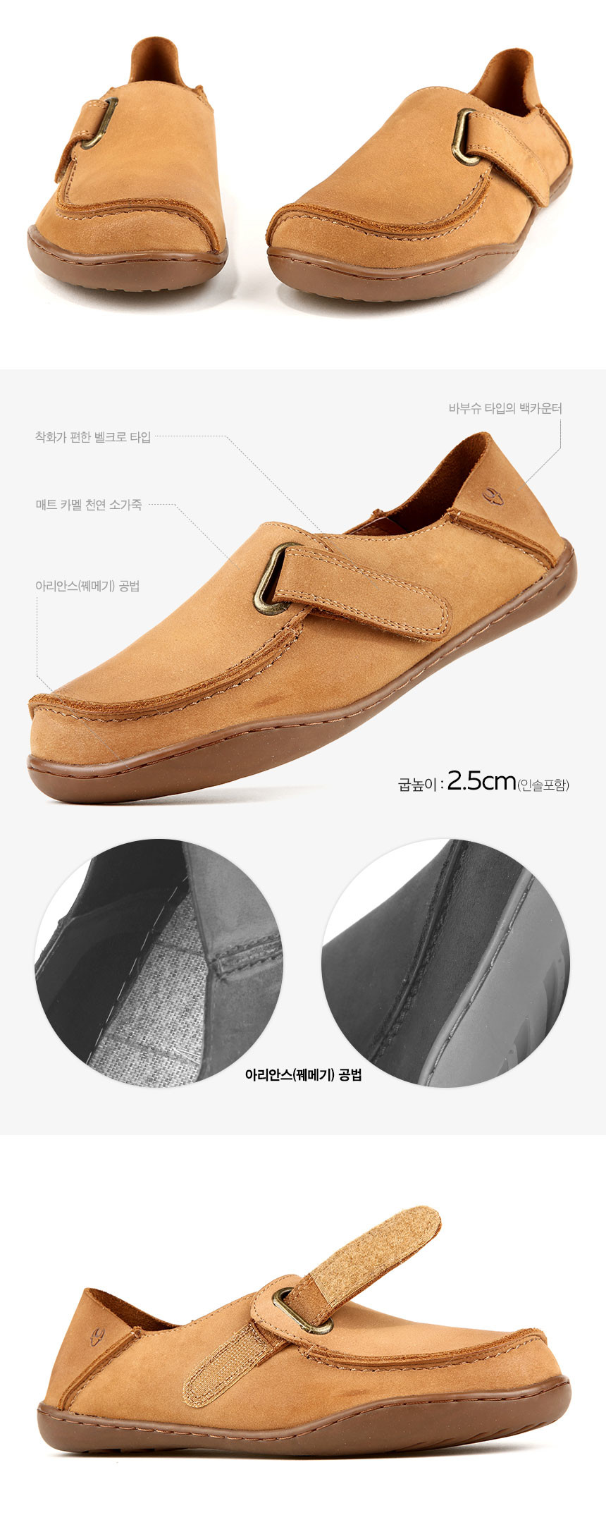 외피: 소가죽 | 내피/깔창: 돈피/라텍스 | 아웃솔: 러버 | 굽높이: 2.5cm