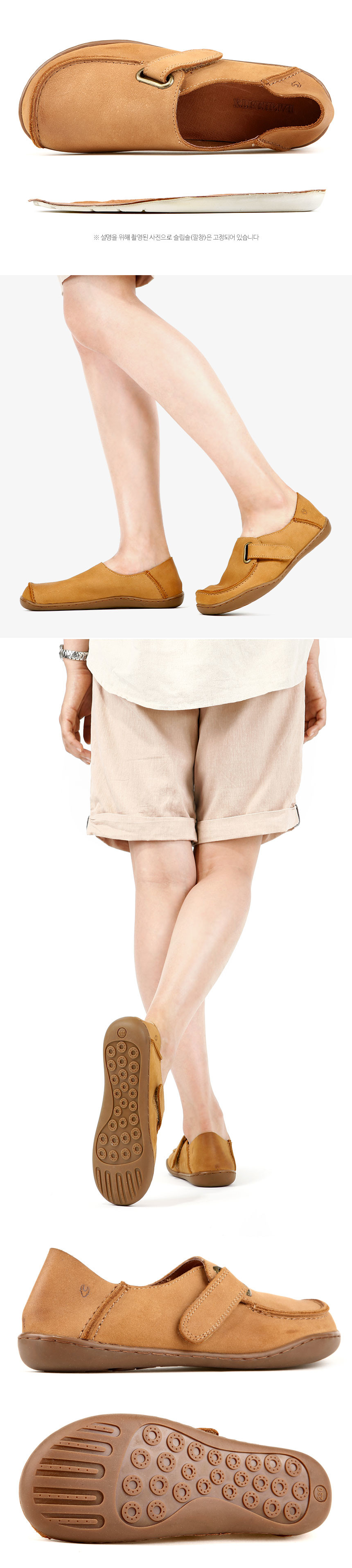 돈피를 덧댄 폭신한 라텍스 깔창이 착화감과 걸음걸이를 기분좋게 만들어 줍니다. 신고 벗기 편한 벨크로 타입은 발등의 높이도 조절 가능하죠.