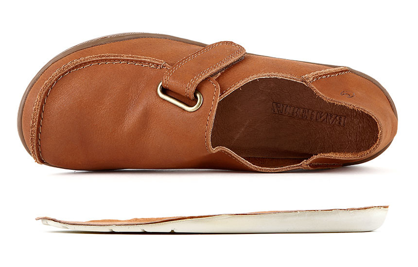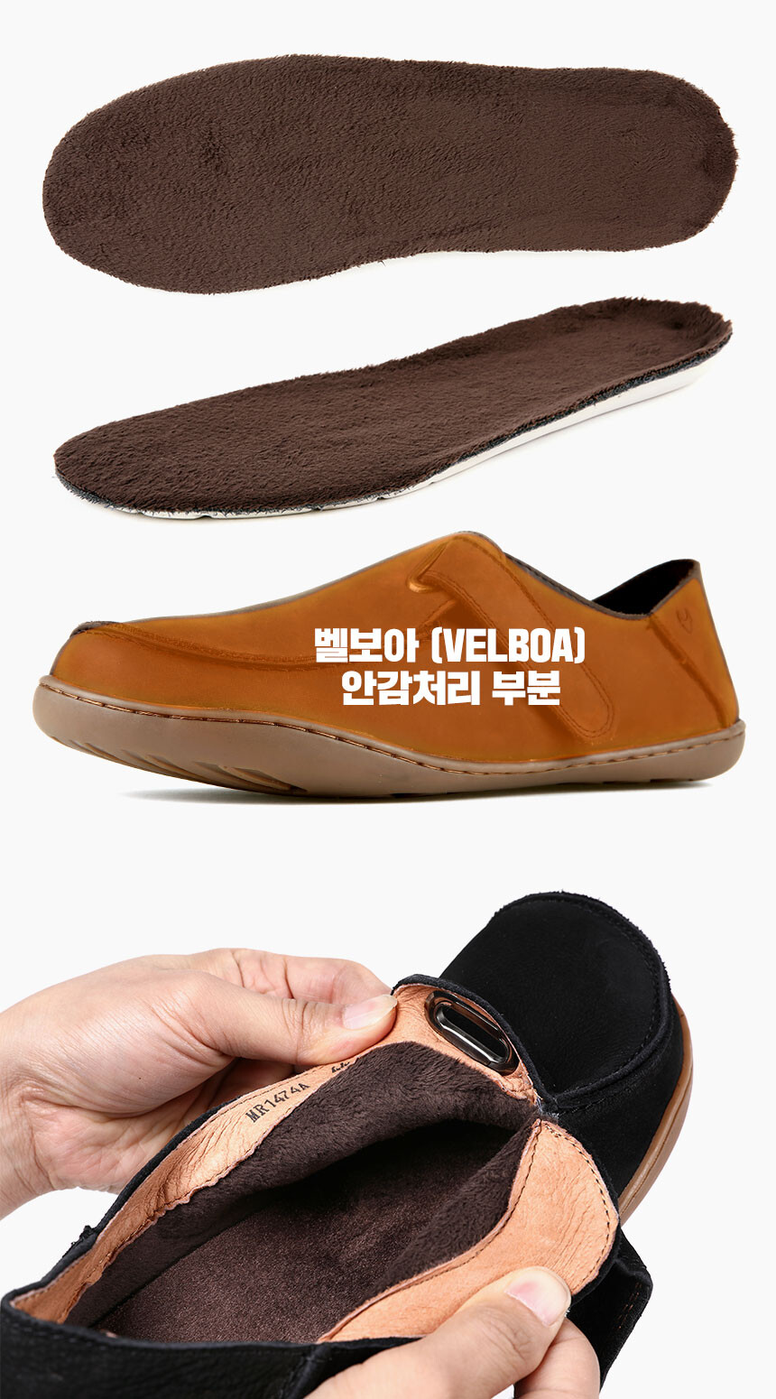 돈피를 덧댄 폭신한 라텍스 깔창이 착화감과 걸음걸이를 기분좋게 만들어 줍니다. 신고 벗기 편한 벨크로 타입은 발등의 높이도 조절 가능하죠.