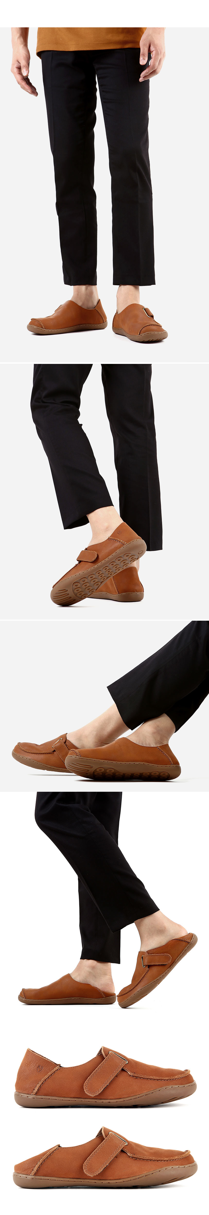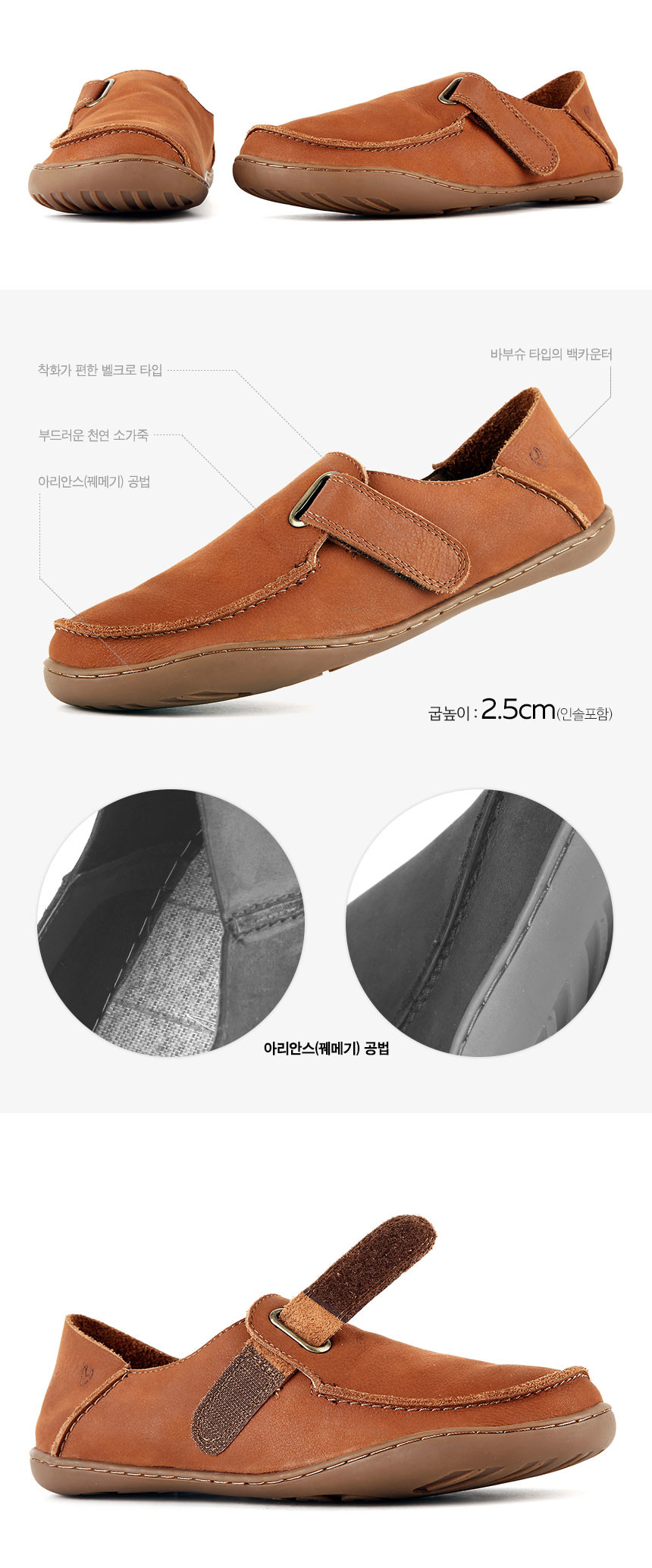 돈피를 덧댄 폭신한 라텍스 깔창이 착화감과 걸음걸이를 기분좋게 만들어 줍니다. 신고 벗기 편한 벨크로 타입은 발등의 높이도 조절 가능하죠.