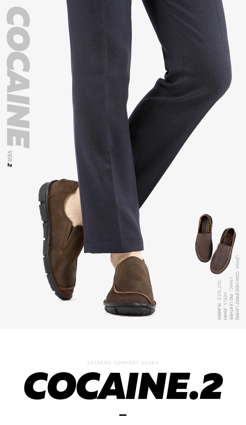슬립온 타입의 슈즈라 굽이 낮다고 생각하는 분들이 많으나, 코카인 시리즈의 굽높이는 3.5cm로 생각보다 두툼한 아웃솔을 가지고 있습니다. 두툼하고 딱딱하지 않은 아웃솔 덕분에 활동량이 많거나 장시간 운전을 할 경우에 더욱 빛을 발합니다.
