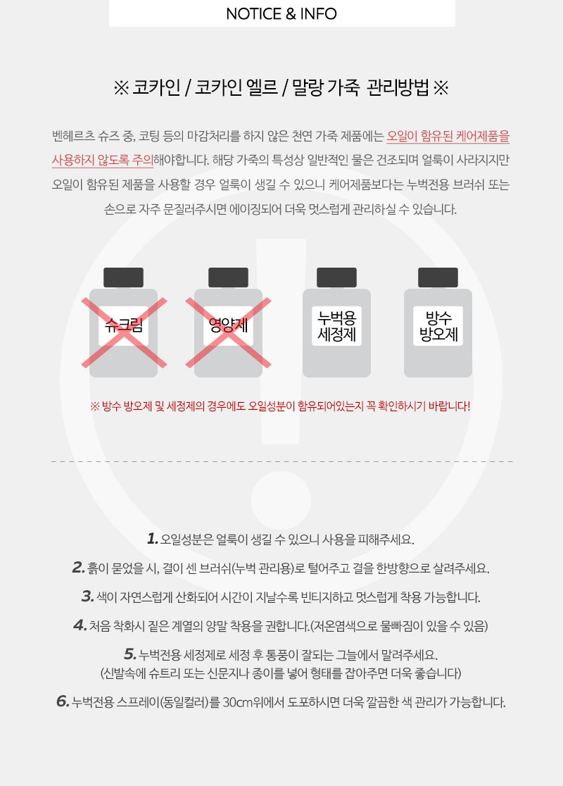 5. 누벅 혹은 스웨이드 제품은 전용 케어상품으로 관리해주십시오. (오일 함유 제품 사용금지)