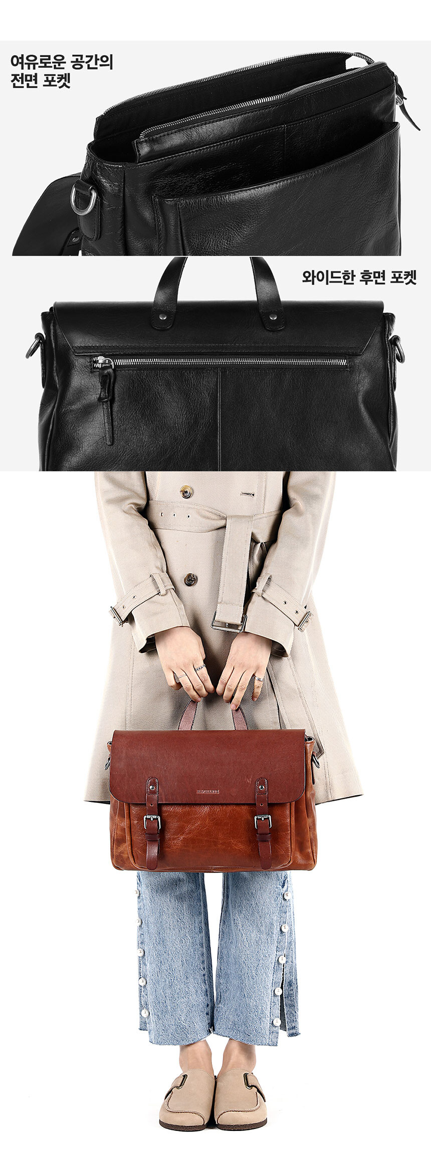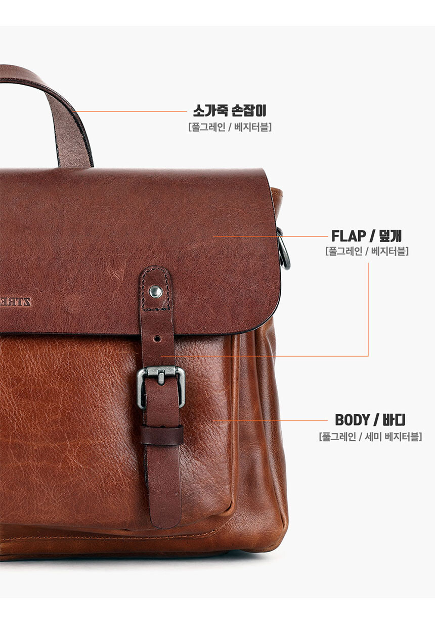 덮개 부분은 두툼하고 매끈한 한 장의 베지터블 가죽으로, 바디에 사용된 소가죽은 두툼하지만 부드러움이 느껴지는 세미 베지터블 가죽이 사용됩니다. 수납물이 없어도 형태가 무너지지 않으며 루즈한 느낌을 자아내는 것이 매력이랍니다.