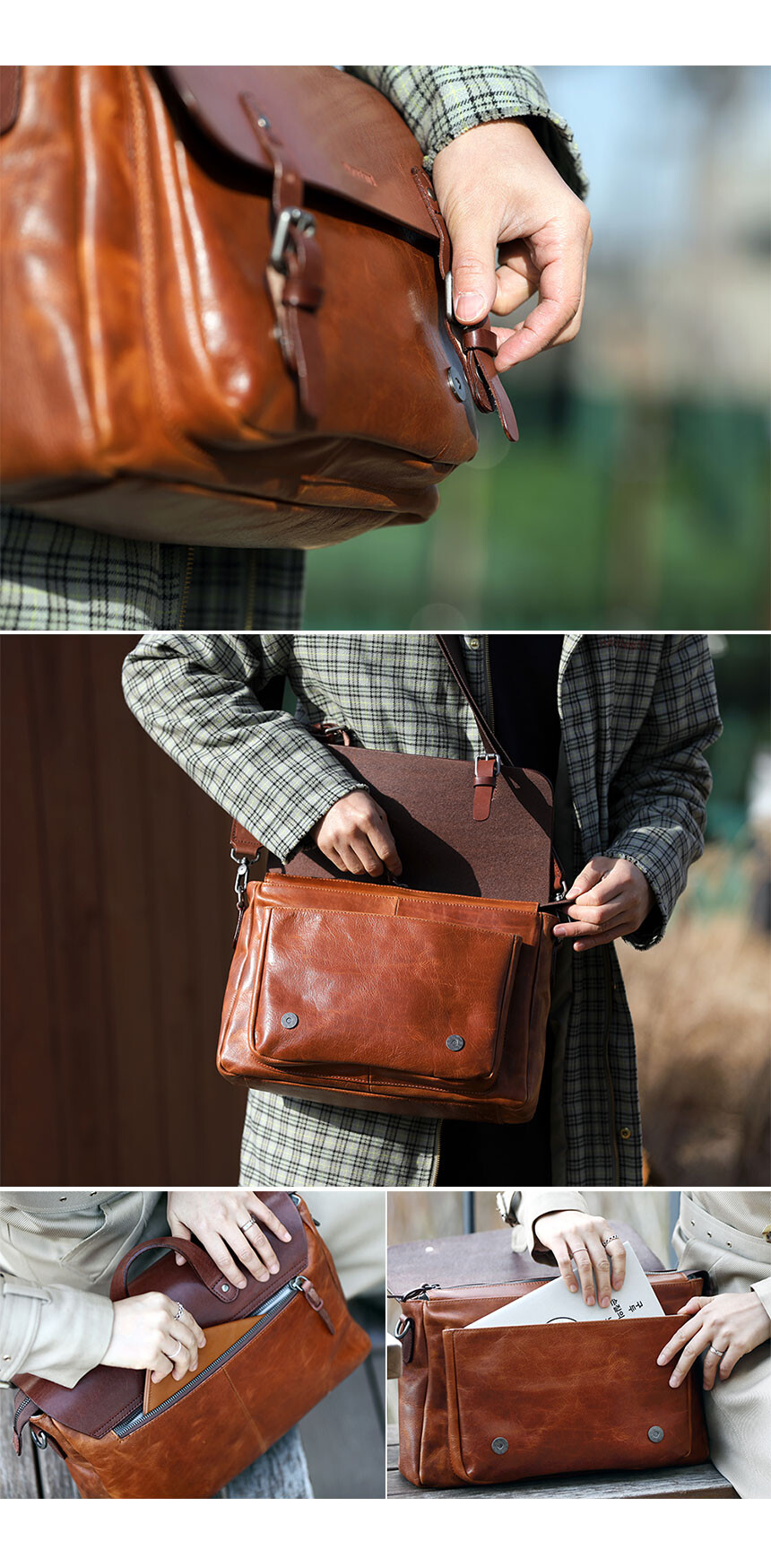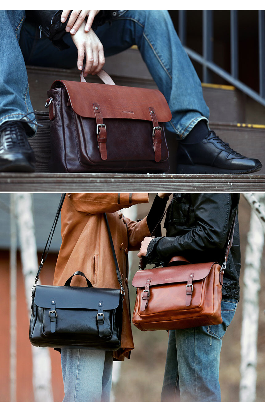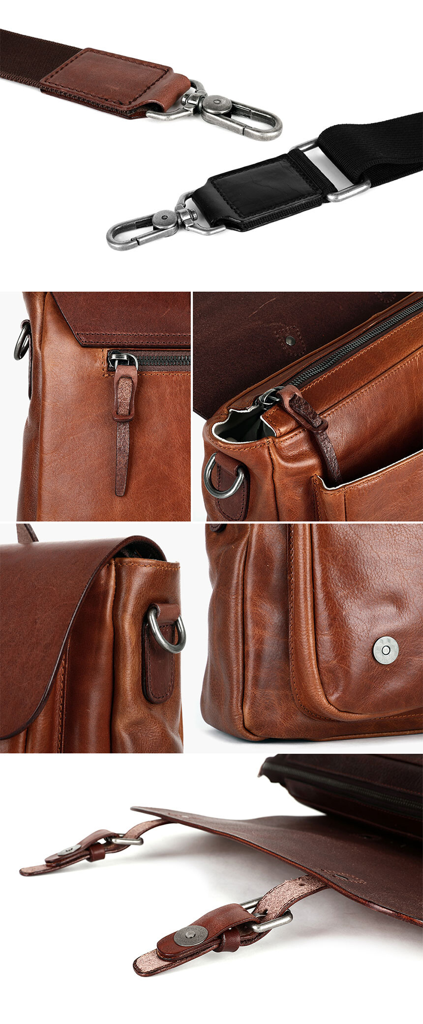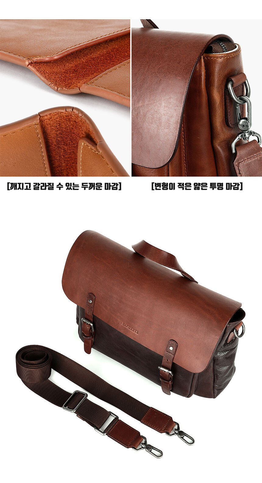 전통 사첼백과 마찬가지로 덮개, 바디, 손잡이 모두를 천연 소가죽으로 제작했습니다. 차이점이라면 각지고 빳빳하게 면이 살아있는 스타일이 아닌, 조금은 캐주얼하고 처음부터 빈티지한 느낌이 강조된 것이죠.