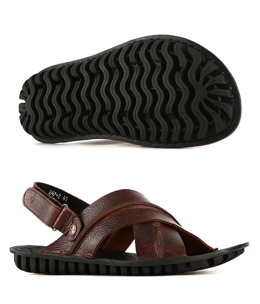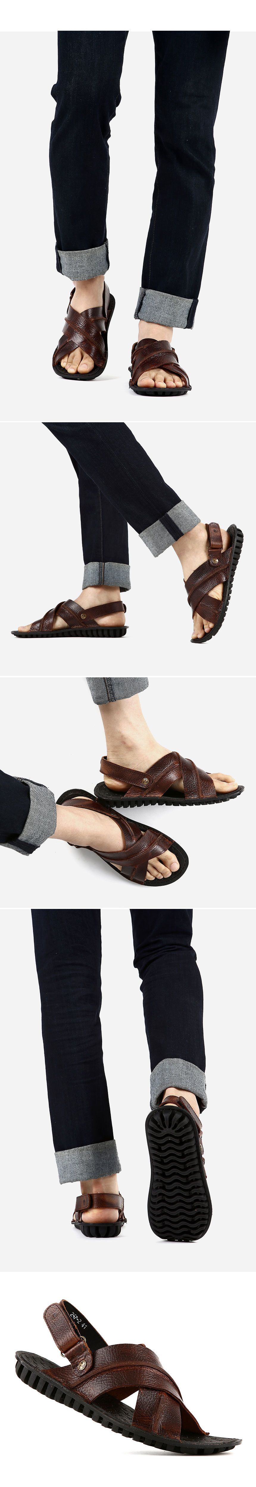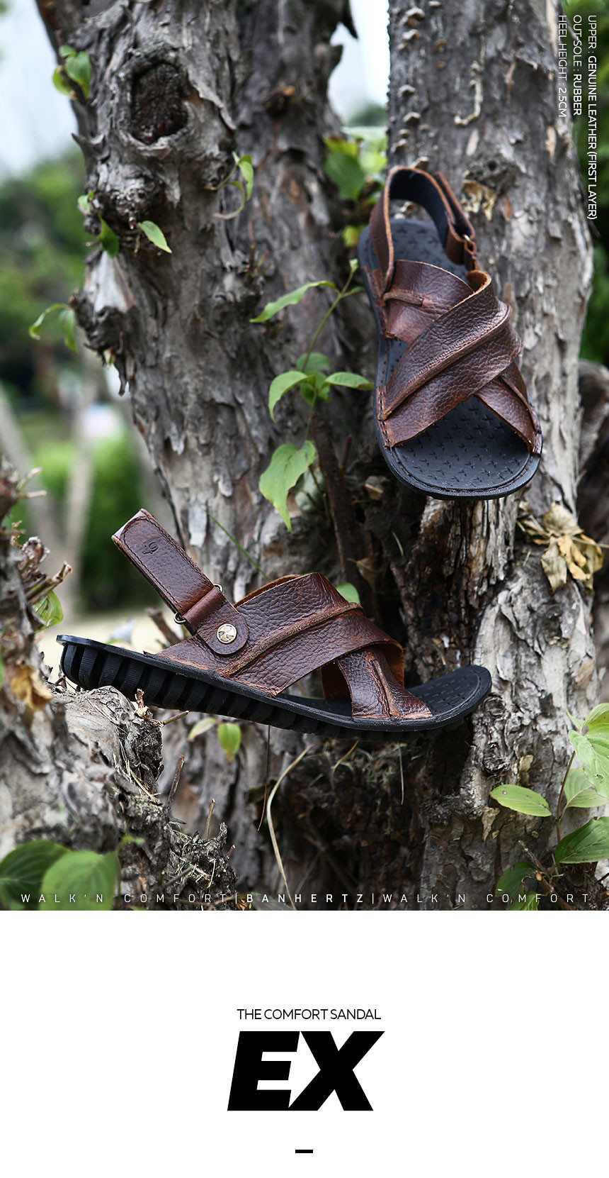 묵직하면서도 골감이 느껴지는 가죽을 교차하여 포인트를 준 소가죽 샌들입니다. 언뜻보기에는 납작한 스타일이지만 적당한 굽을 가지고 있으며, 바닥의 웨이브 패턴으로 유연함이 매력적인 샌들 ‘엑스(EX)’로 시원한 여름을 보내세요!