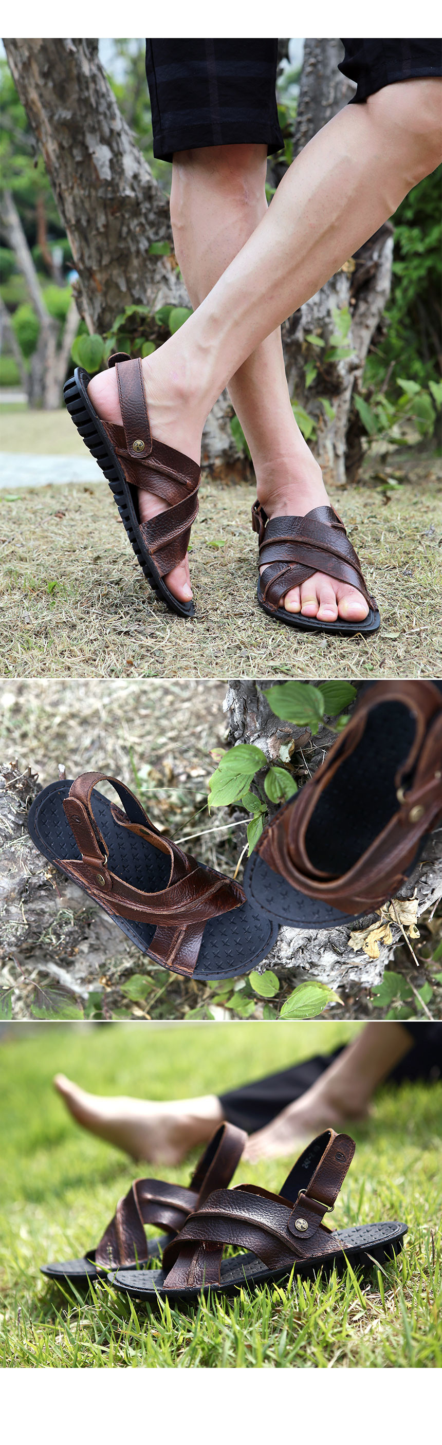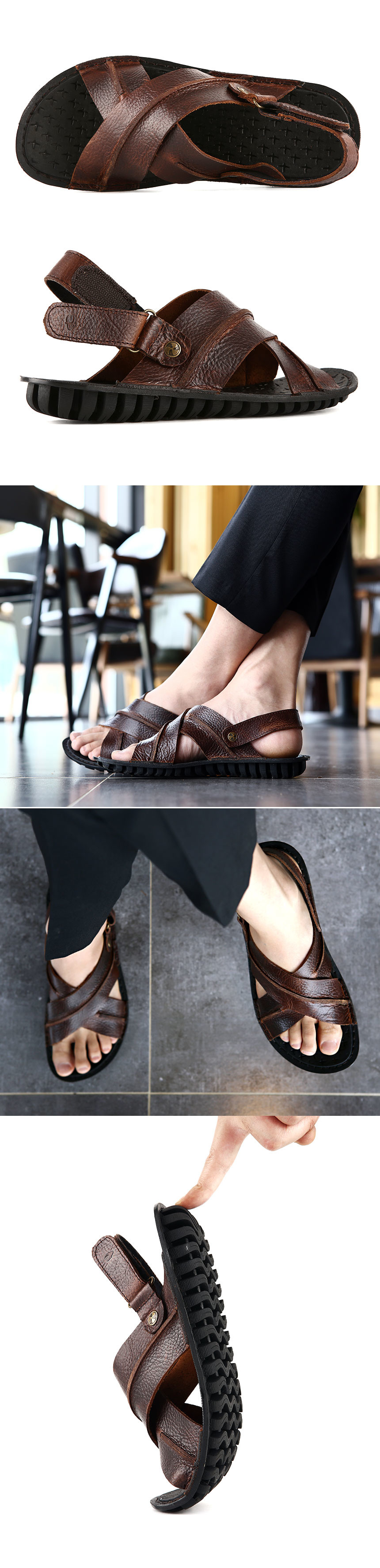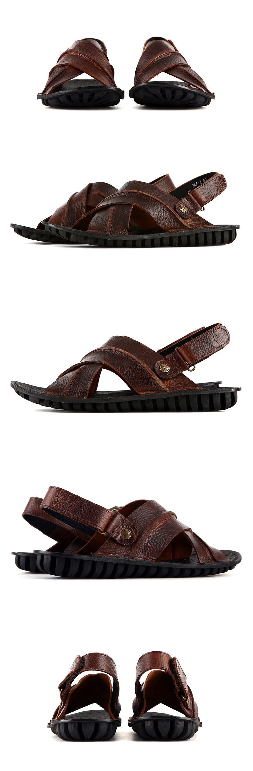 묵직하면서도 골감이 느껴지는 가죽을 교차하여 포인트를 준 소가죽 샌들입니다. 언뜻보기에는 납작한 스타일이지만 적당한 굽을 가지고 있으며, 바닥의 웨이브 패턴으로 유연함이 매력적인 샌들 ‘엑스(EX)’로 시원한 여름을 보내세요!