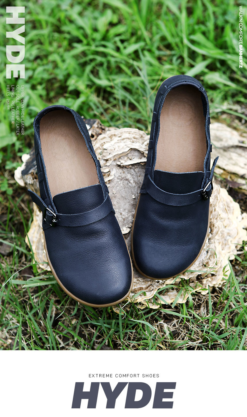 여유롭고 둥근 앞코와 발볼을 가진 컴포트 슈즈. 하이드(HYDE) 부드러운 촉감을 가진 소가죽과 발등부터 뒤꿈치까지 감싸는 스트랩으로 디테일을 살렸으며, 천연 라텍스 위를 돈피로 마감하여 쿠션감과 밀착감이 뛰어나 장시간 착화에도 편안한 착화감을 느낄 수 있는 데일리 슈즈입니다.