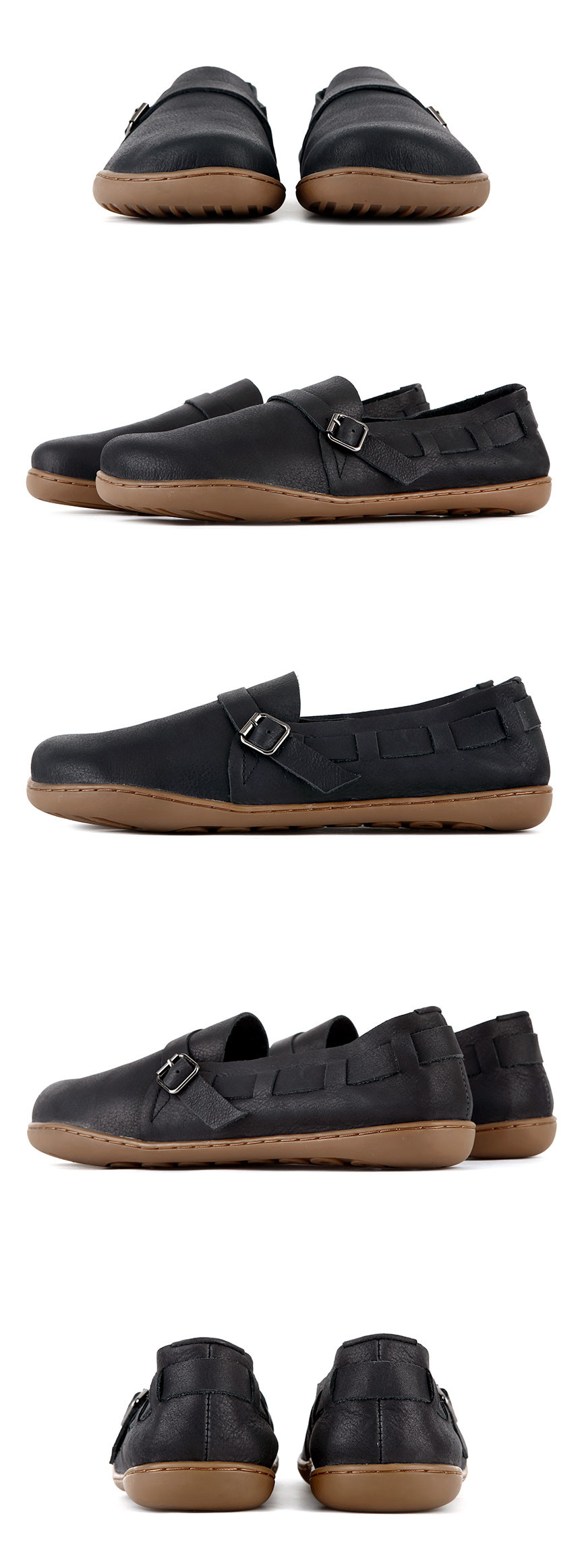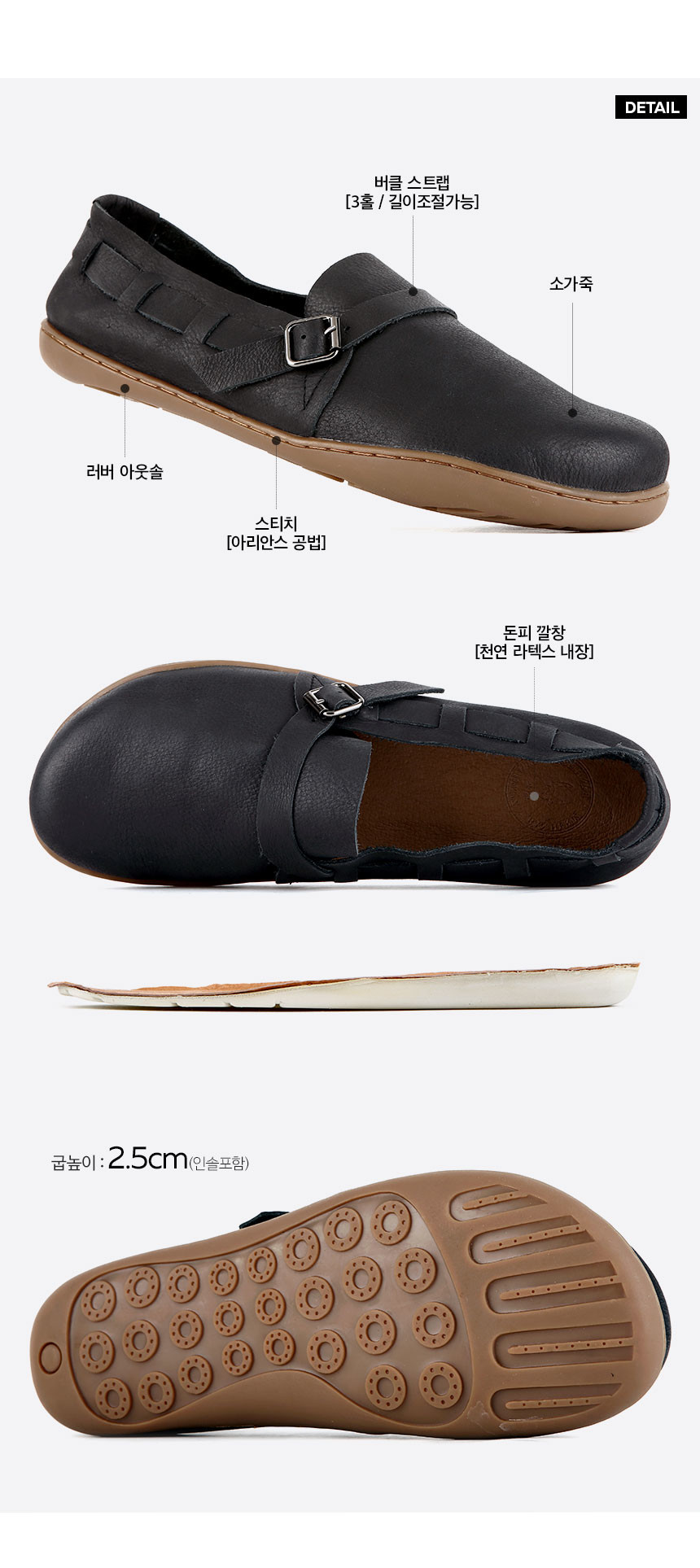 보들보들한 촉감이 매력적인 소가죽이 발을 부드럽게 감싸주며 가죽 스트랩으로 포인트를 살렸습니다. 메탈 버클과 스트랩에는 3개의 홀이 마련되어 있으니 발등 높이에 맞게 조절하여 착용 가능합니다.
