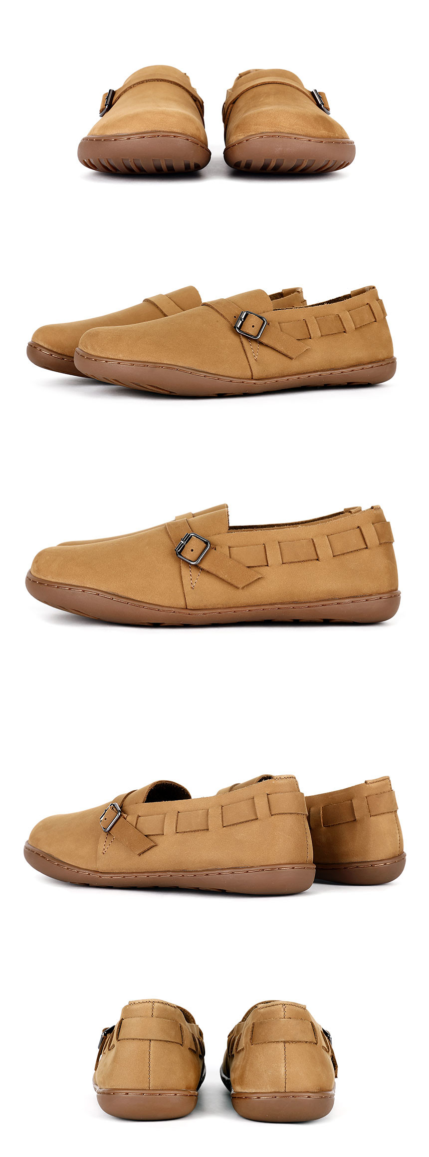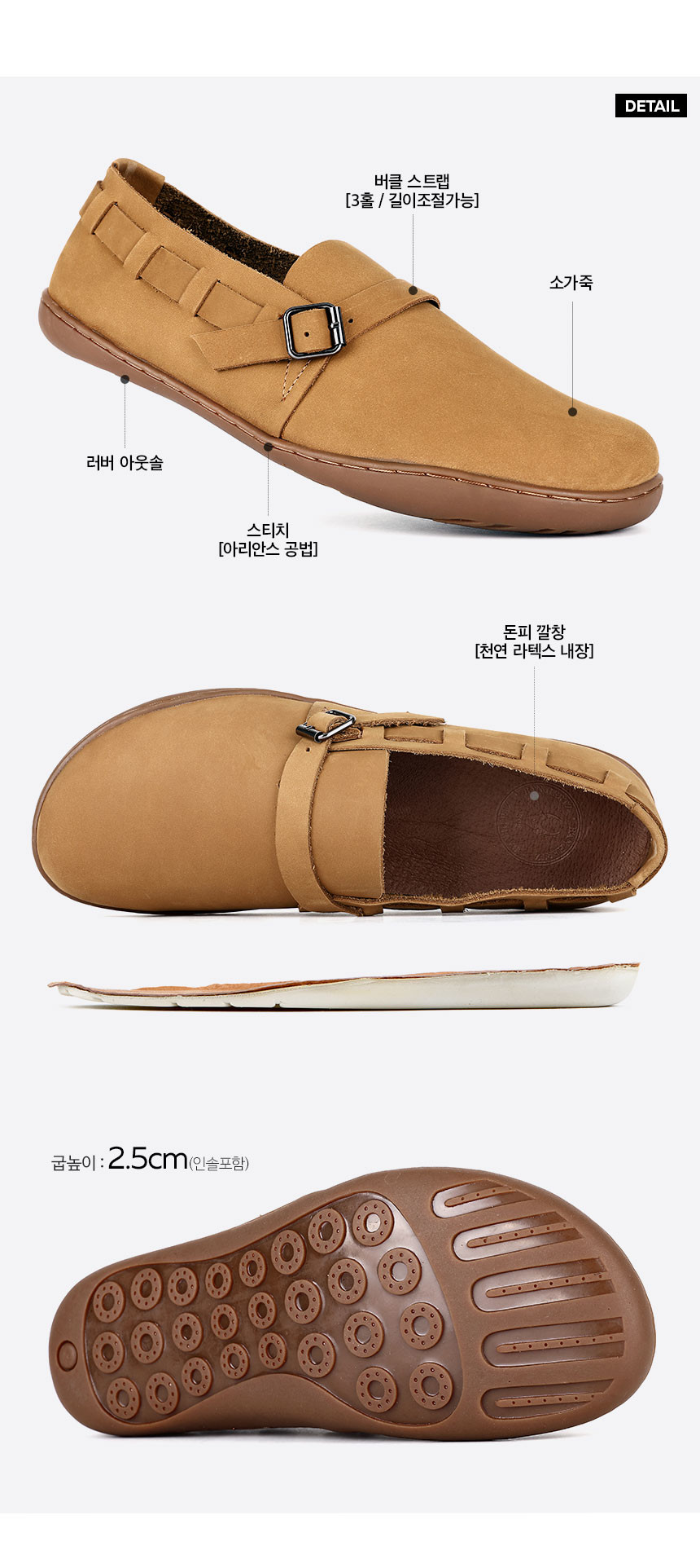 보들보들한 촉감이 매력적인 소가죽이 발을 부드럽게 감싸주며 가죽 스트랩으로 포인트를 살렸습니다. 메탈 버클과 스트랩에는 3개의 홀이 마련되어 있으니 발등 높이에 맞게 조절하여 착용 가능합니다.