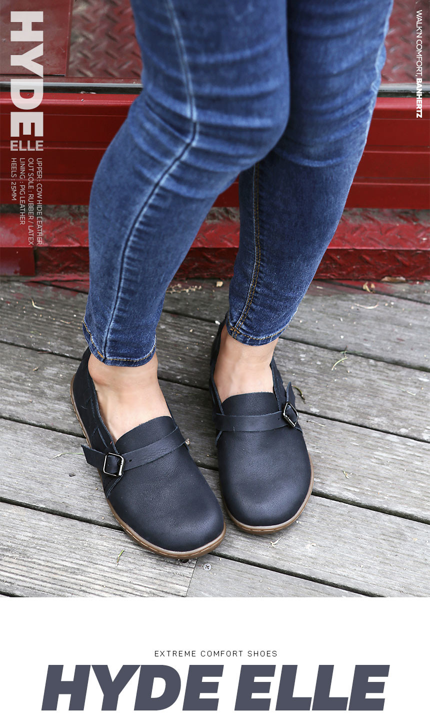 여유롭고 둥근 앞코와 발볼을 가진 컴포트 슈즈, 하이드 엘르(HYDE ELLE). 부드러운 촉감을 가진 소가죽과 발등부터 뒤꿈치까지 감싸는 스트랩으로 디테일을 살렸으며, 천연 라텍스 위를 돈피로 마감하여 쿠션감과 밀착감이 뛰어나 장시간 착화에도 편안한 착화감을 느낄 수 있는 데일리 슈즈입니다.