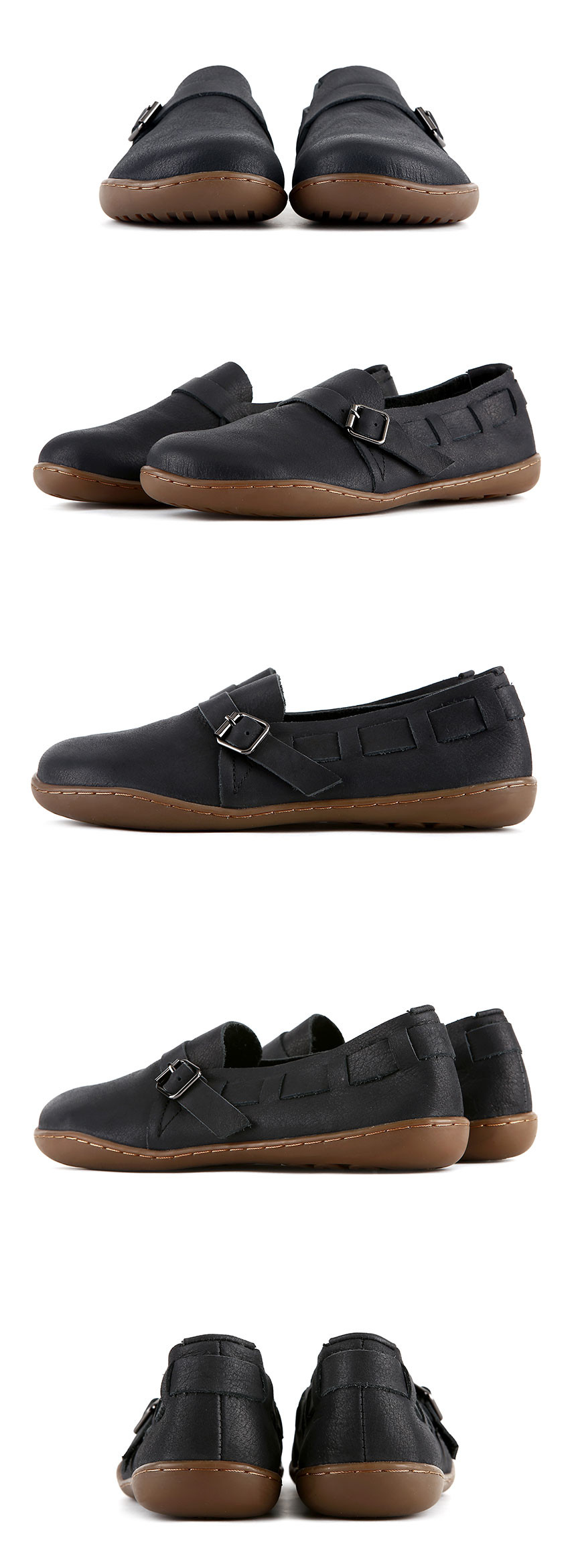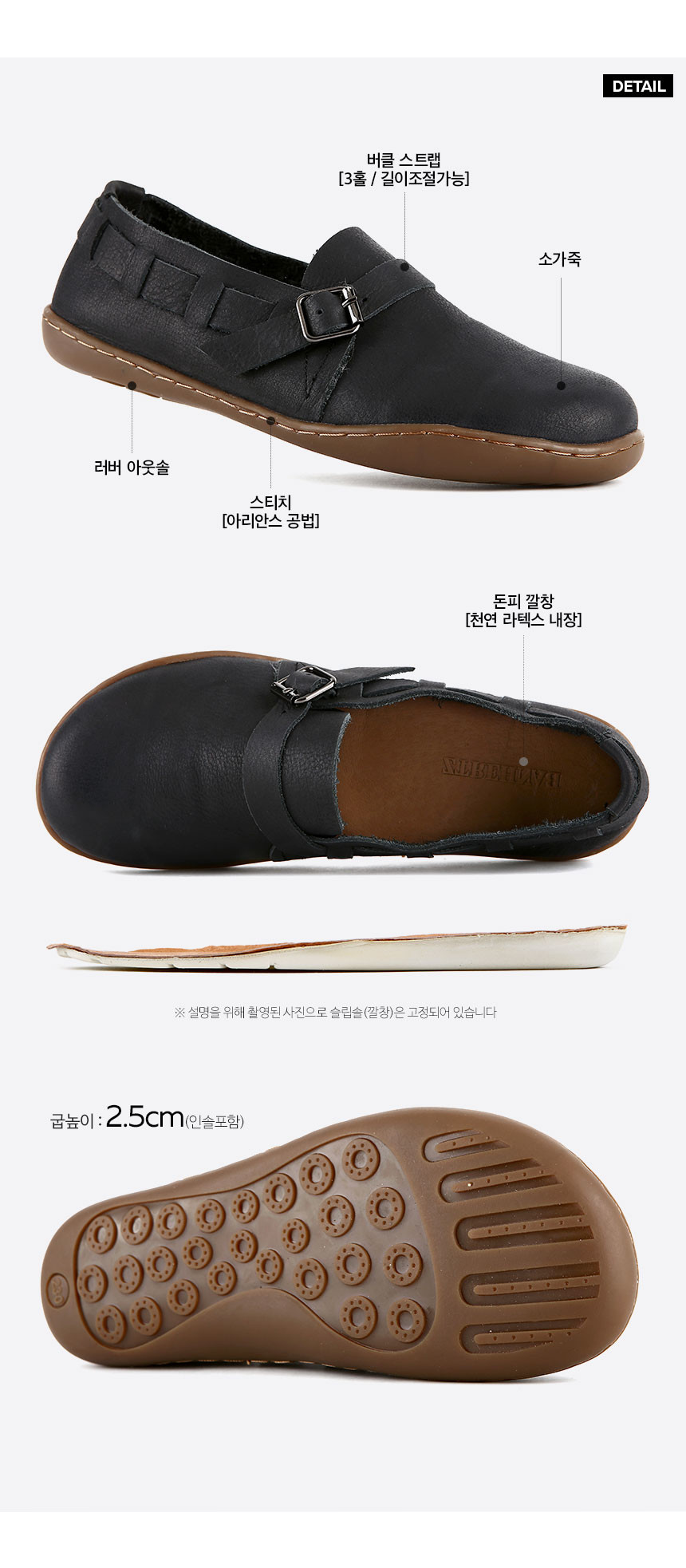 보들보들한 촉감이 매력적인 소가죽이 발을 부드럽게 감싸주며 가죽 스트랩으로 포인트를 살렸습니다. 메탈 버클과 스트랩에는 3개의 홀이 마련되어 있으니 발등 높이에 맞게 조절하여 착용 가능합니다.