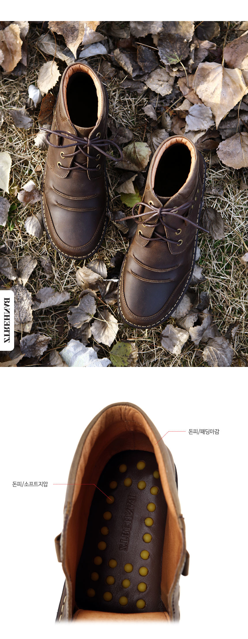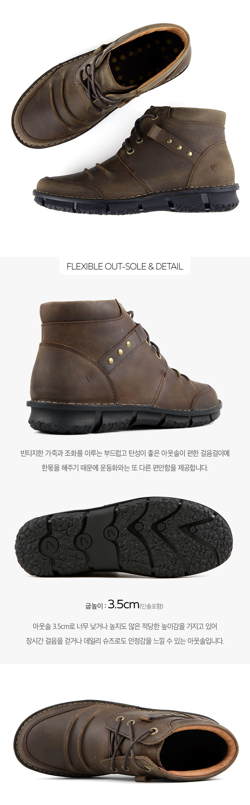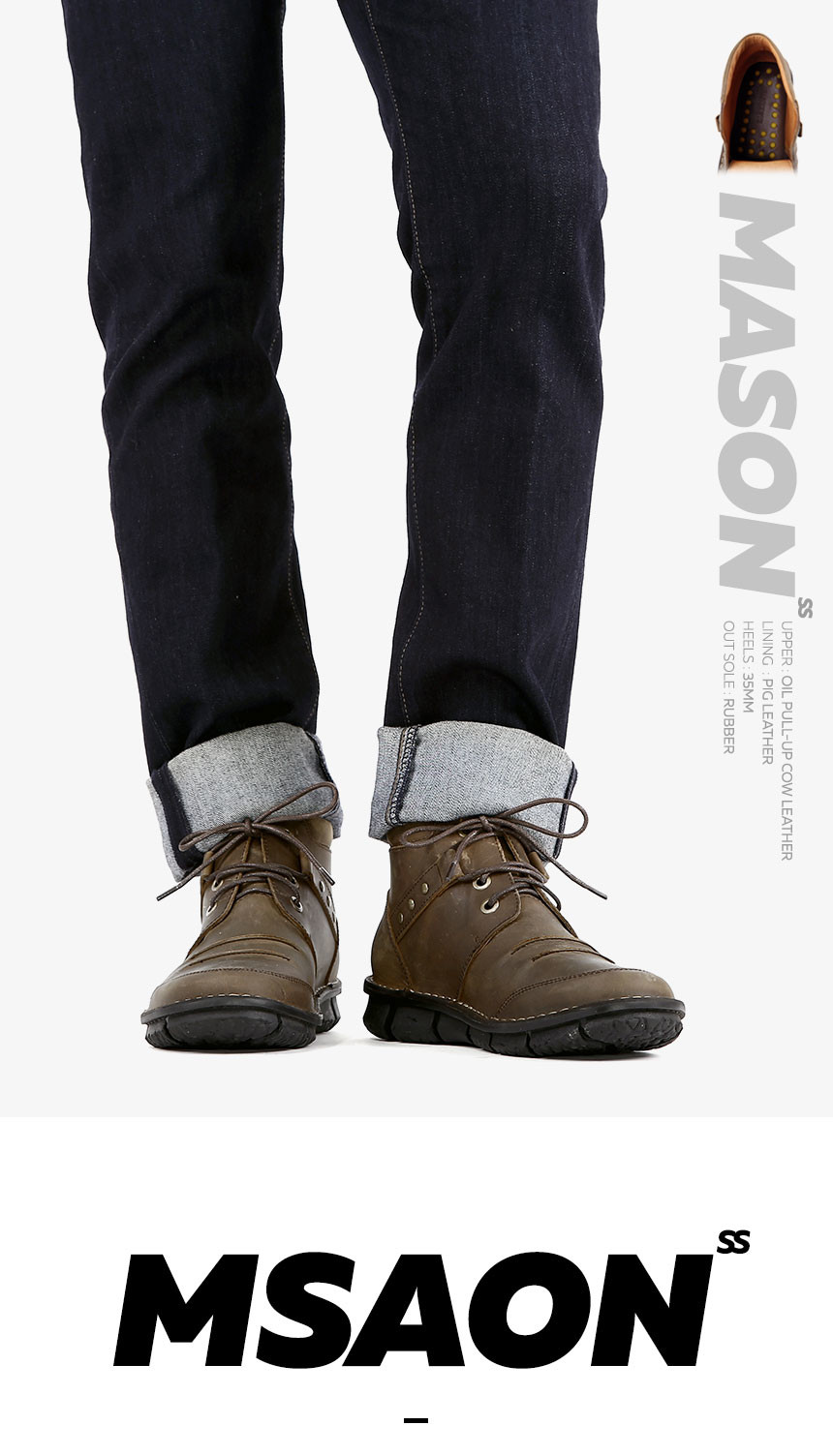 겨울용 방한화로 먼저 출시되었던 메이슨(MASON)은 수 많은 개발 요청에 의해 S/S 시즌 상품으로도 선보이게 되었습니다. 빈티지한 오일 풀업 가죽을 사용한 외관 디자인은 동일하며 안감을 돈피로 교체하고, 벤헤르츠 편한신발의 특징 중 하나인 ‘소프트 지압 돌기’를 채용하여 더욱 편한 착화감을 느낄 수 있습니다.