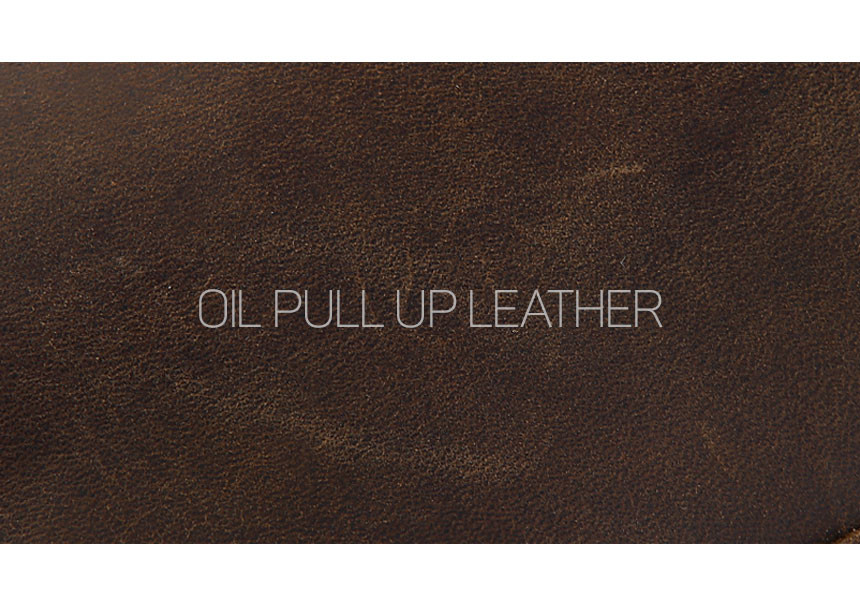 오일 풀업 가죽이란 베지터블 가죽에 왁스 가공을 하여 접혀 튀어나온 부분이 더욱 밝은색으로 올라오는 특징이 있습니다. 또한 깊은 컬러감과 촉촉한 느낌을 전해줍니다.