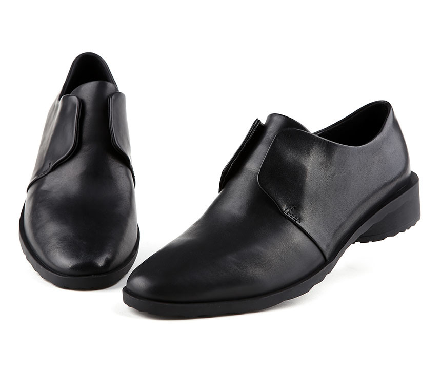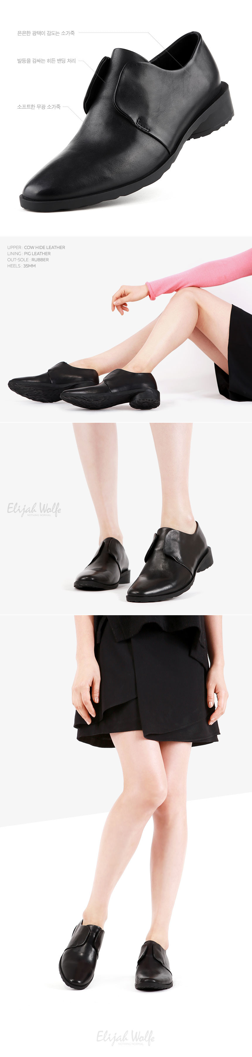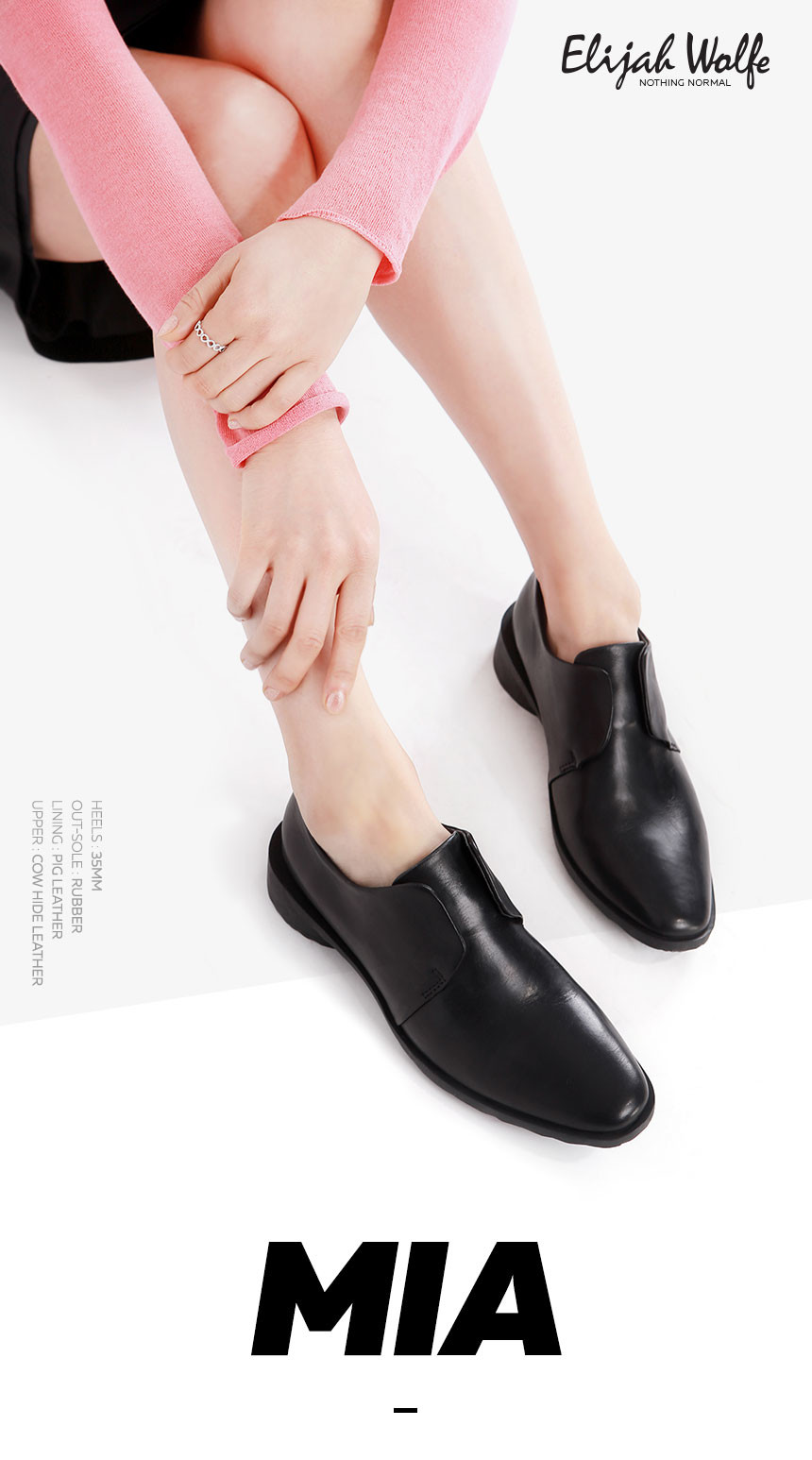 끈이 없는 심플한 더비 타입으로 길게 뻗은 앞코가 매력적인 슈즈, 미아(MIA). 고밀도 러버 아웃솔과 라텍스 슬립솔로 편안한 착화감을 느낄 수 있으며 은은한 광택이 감도는 소가죽과 밴딩처리된 발등의 날개가 독특한 여성슈즈입니다.