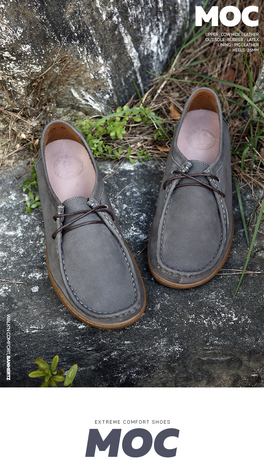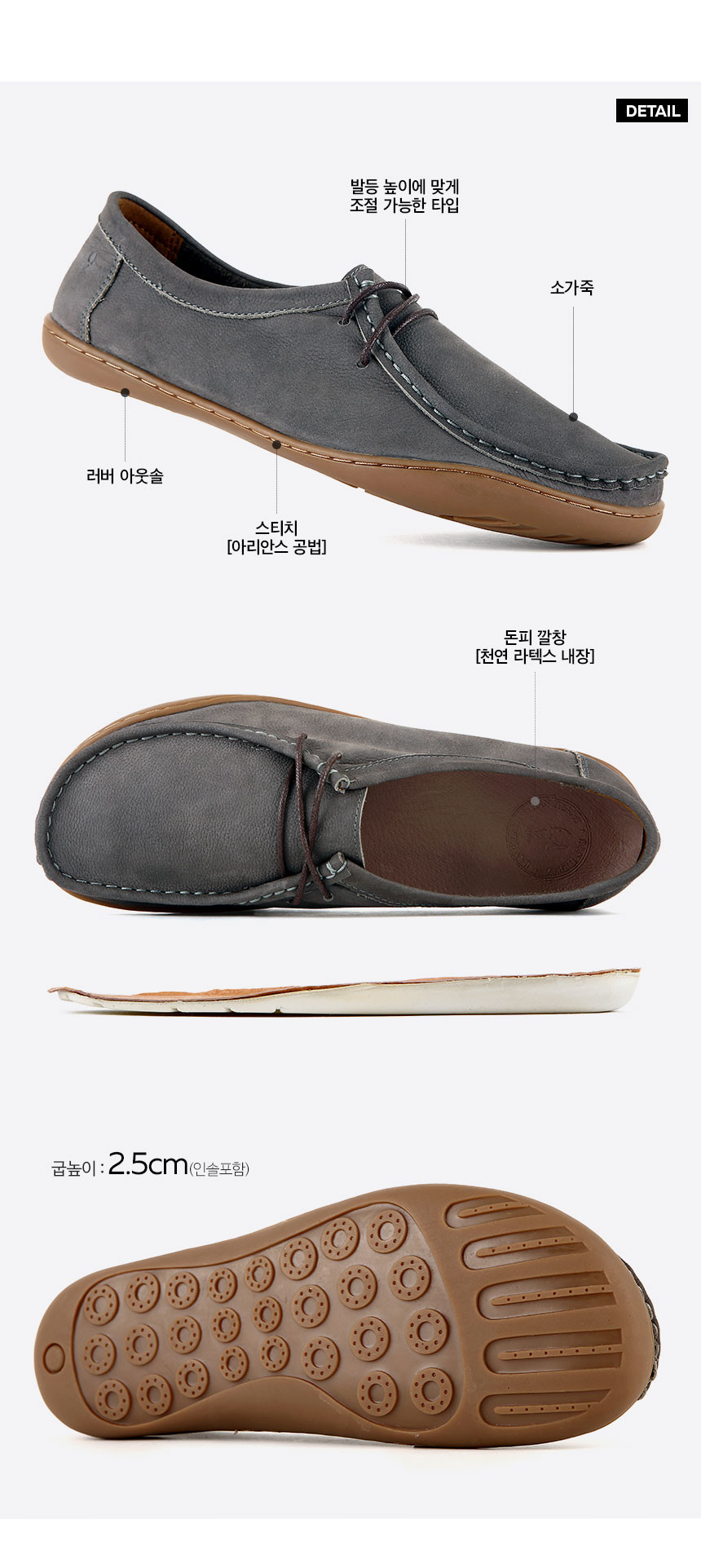 둥근 앞코와 발볼, 그리고 발등까지 여유로운 컴포트 슈즈. 목(MOC) 동일한 제품 라인의 카인, 하이드 보다 발등이 여유로운 구조를 가졌습니다. 부드러운 촉감을 가진 소가죽 갑피와 두툼한 천연 라텍스 깔창 위를 돈피로 마감하여 쿠션과 밀착감이 뛰어나며 장시간 착화에도 편안함을 제공하죠!