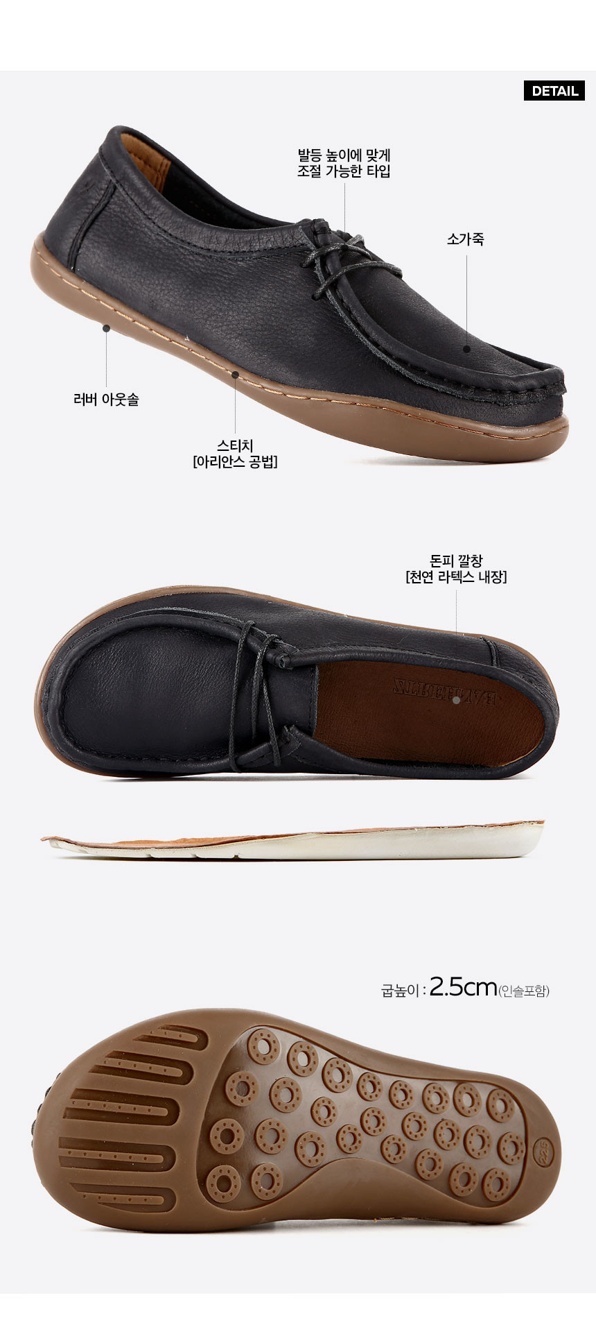 보들보들한 촉감이 매력적인 소가죽이 발을 부드럽게 감싸주며 발등을 덮는 양 날개를 끈으로 조절 하기 쉬운 타입으로 발등이 높거나 두껍더라도 편한한 착용이 가능합니다.