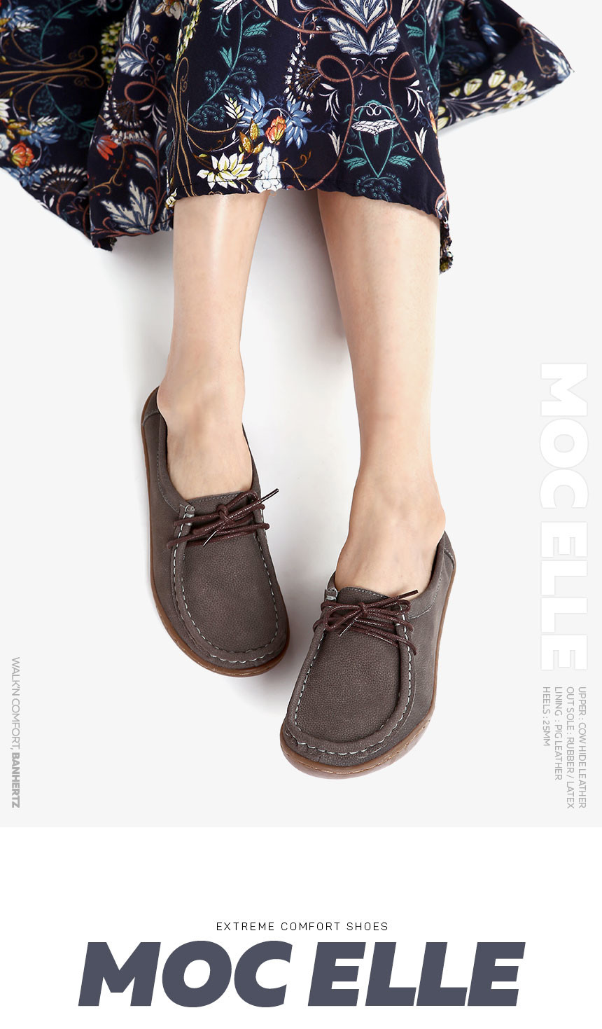 둥근 앞코와 발볼, 그리고 발등까지 여유로운 컴포트화. 목 엘르(MOC ELLE) 동일한 제품 라인의 카인, 하이드 보다 발등이 여유로운 구조를 가졌습니다. 부드러운 촉감을 가진 소가죽 갑피와 두툼한 천연 라텍스 깔창 위를 돈피로 마감하여 쿠션과 밀착감이 뛰어나며 장시간 착화에도 편안함을 제공하죠!