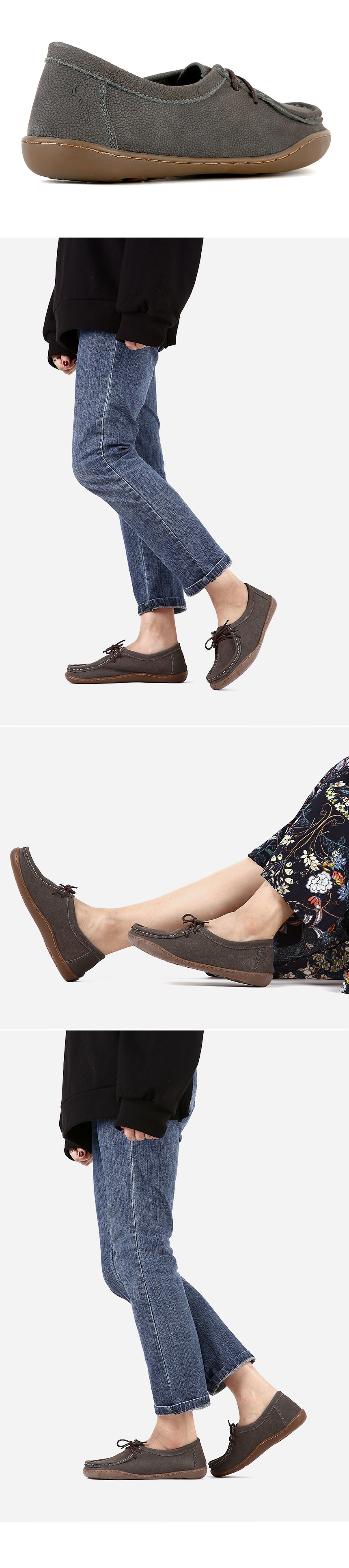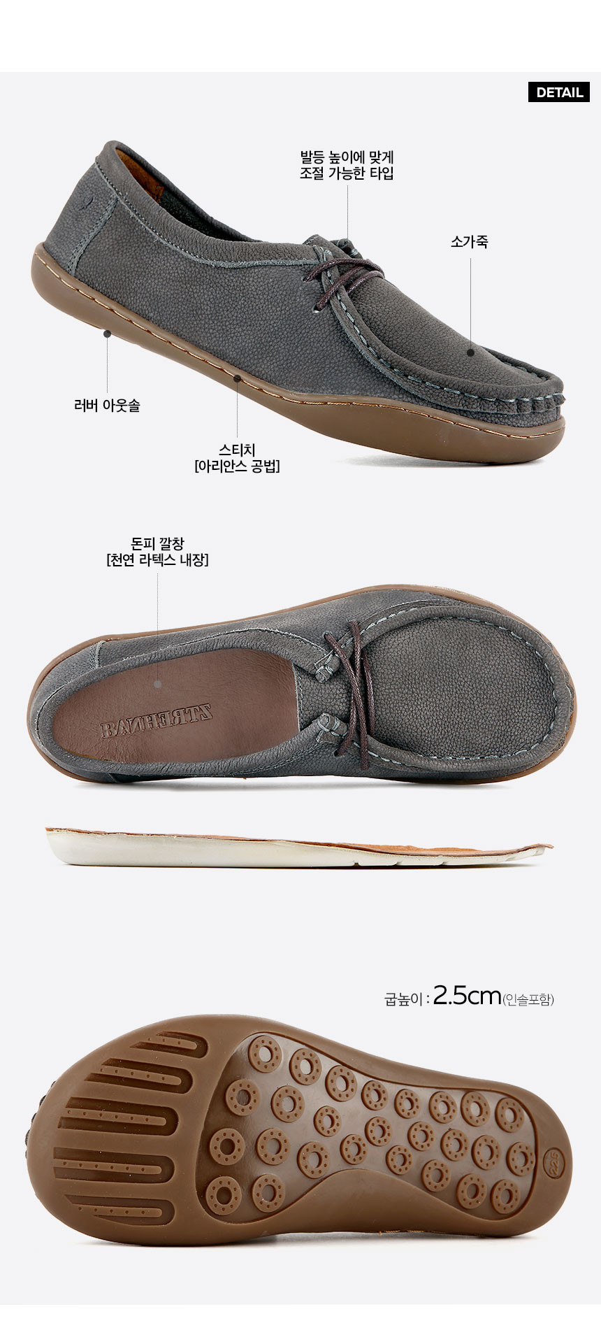 보들보들한 촉감이 매력적인 소가죽이 발을 부드럽게 감싸주며 발등을 덮는 양 날개를 끈으로 조절 하기 쉬운 타입으로 발등이 높거나 두껍더라도 편한한 착용이 가능합니다.