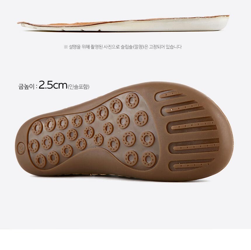 보들보들한 촉감이 매력적인 소가죽이 발을 부드럽게 감싸주며 발등을 덮는 양 날개를 끈으로 조절 하기 쉬운 타입으로 발등이 높거나 두껍더라도 편한한 착용이 가능합니다.