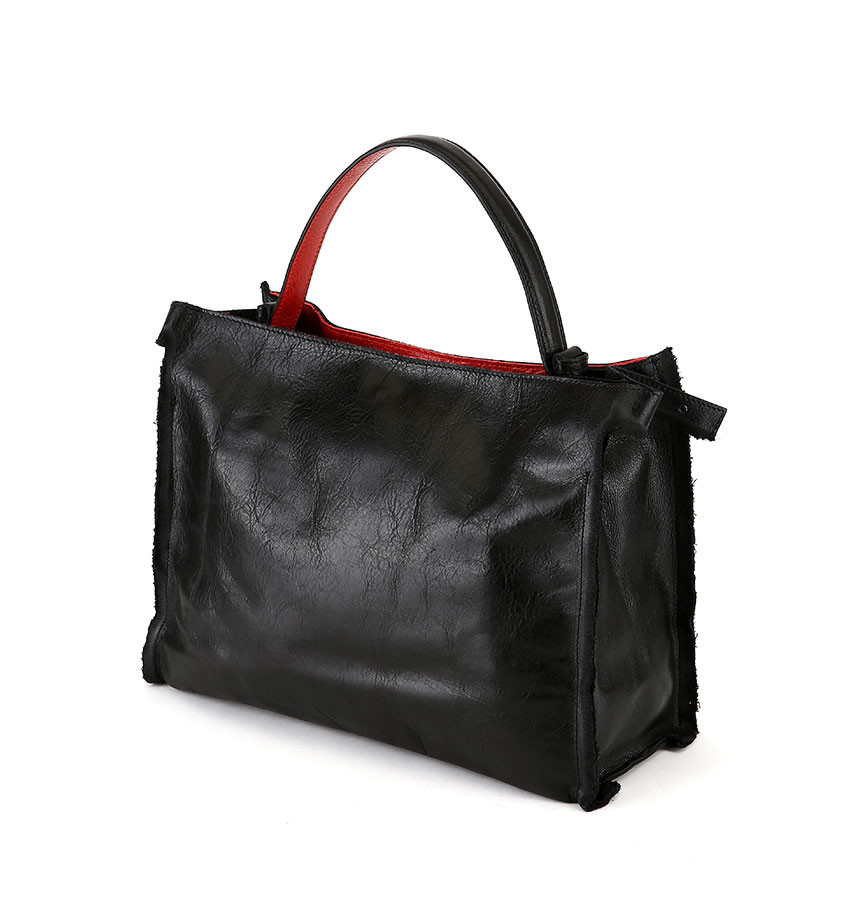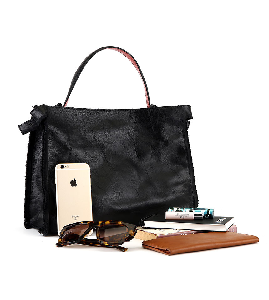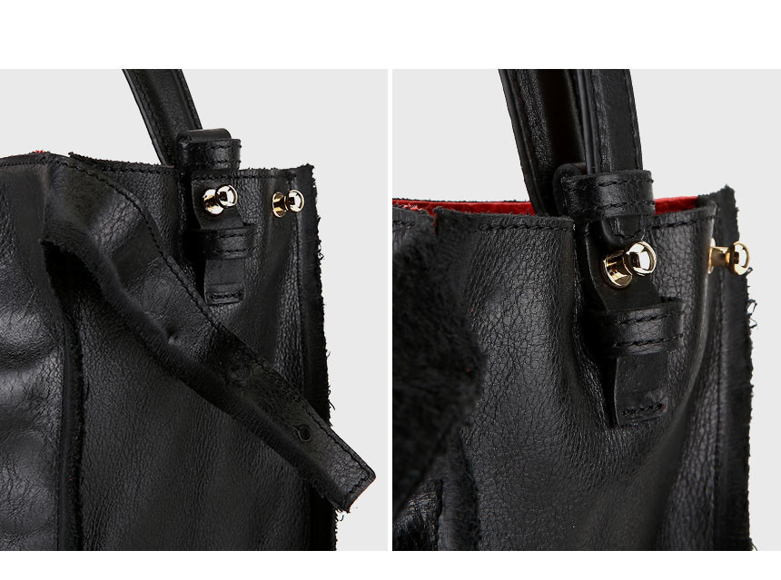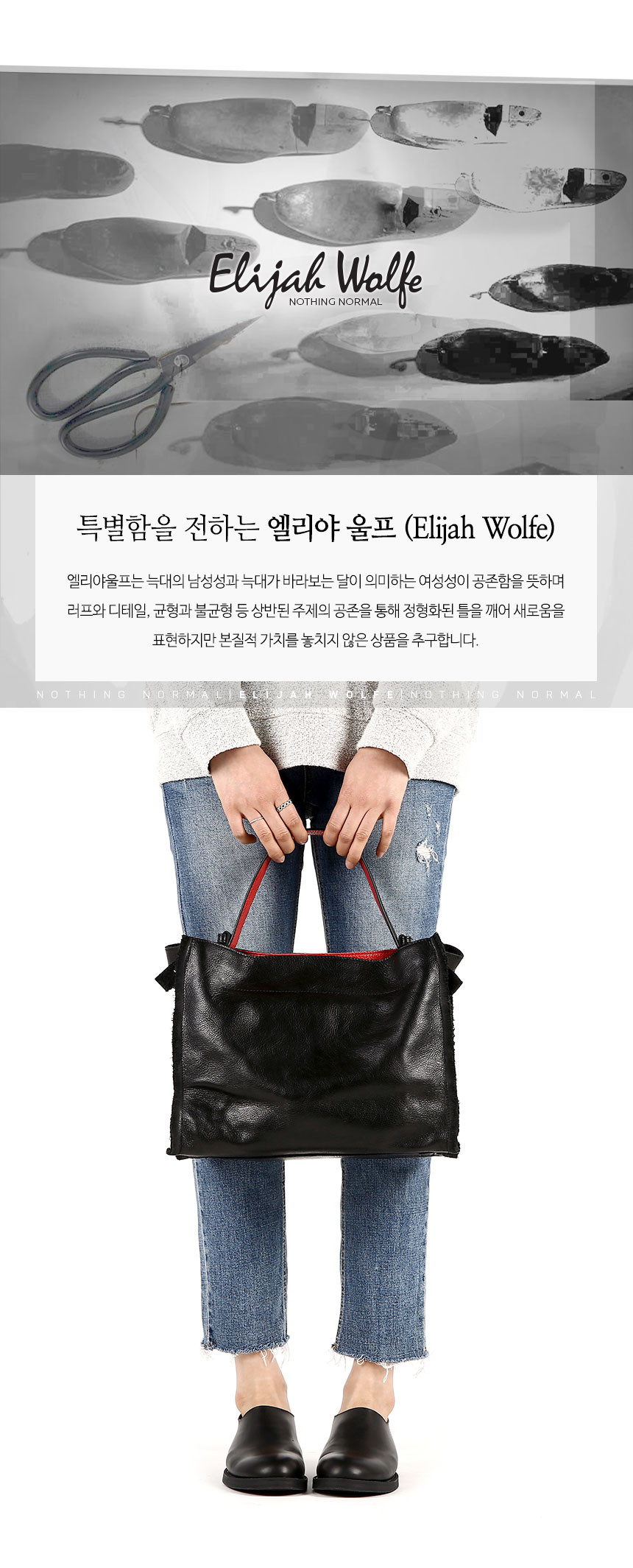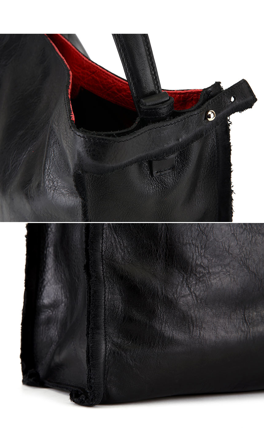강철 브러쉬로 긁어서 표현한 수작업 엣지 마감이 루즈한 가방의 디테일을 더욱 살려줍니다. 메인 소재인 홑겹 통가죽의 내부 질감과도 잘 어울리죠.