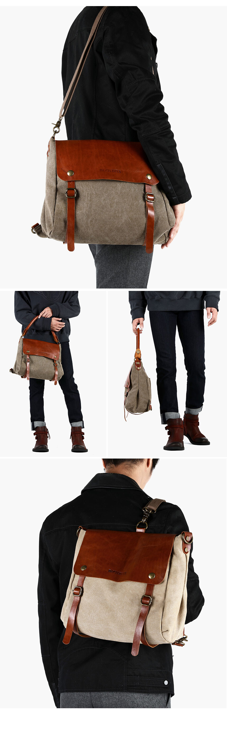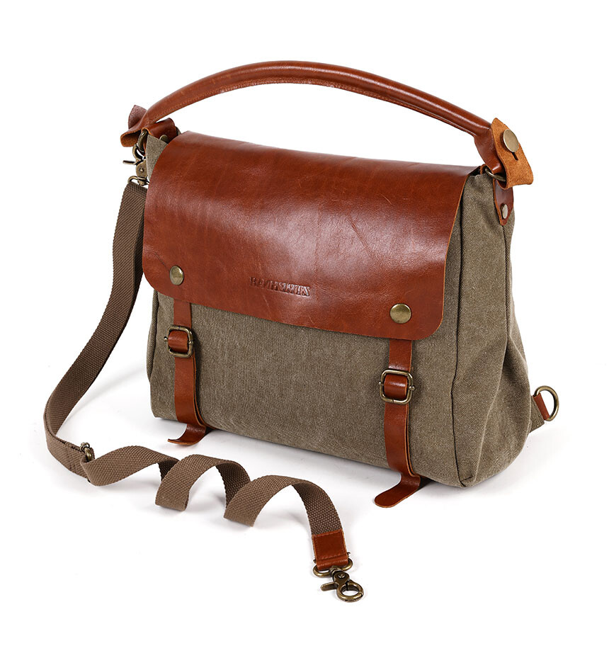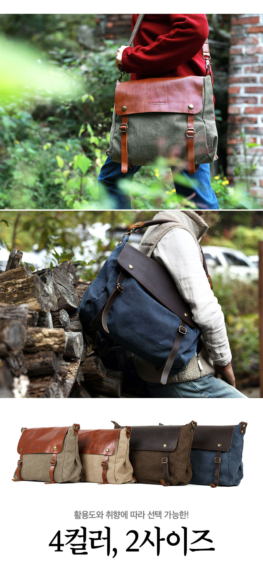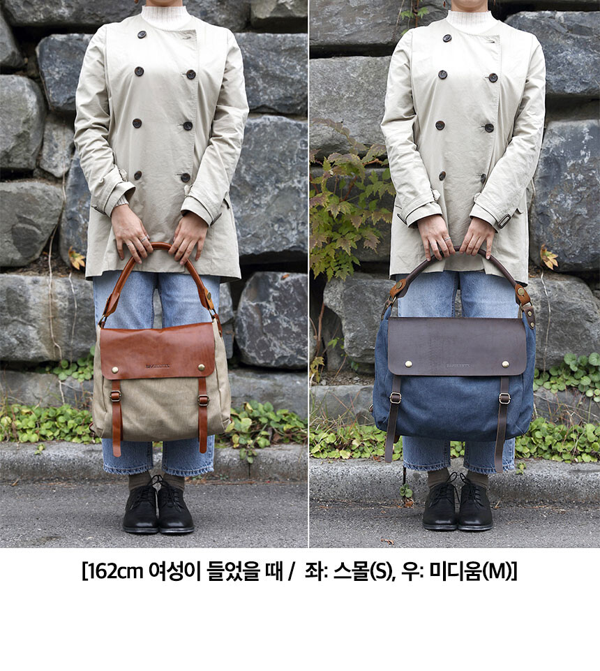 프로그램 메신저는 미디움(M)과 스몰(S)사이즈 두 가지로 제작됩니다. 모두 워싱 캔버스와 소가죽의 조합으로 이루어져 있으며, 컬러 배색에 맞춰 2가지 종류의 가죽이 사용되었습니다.