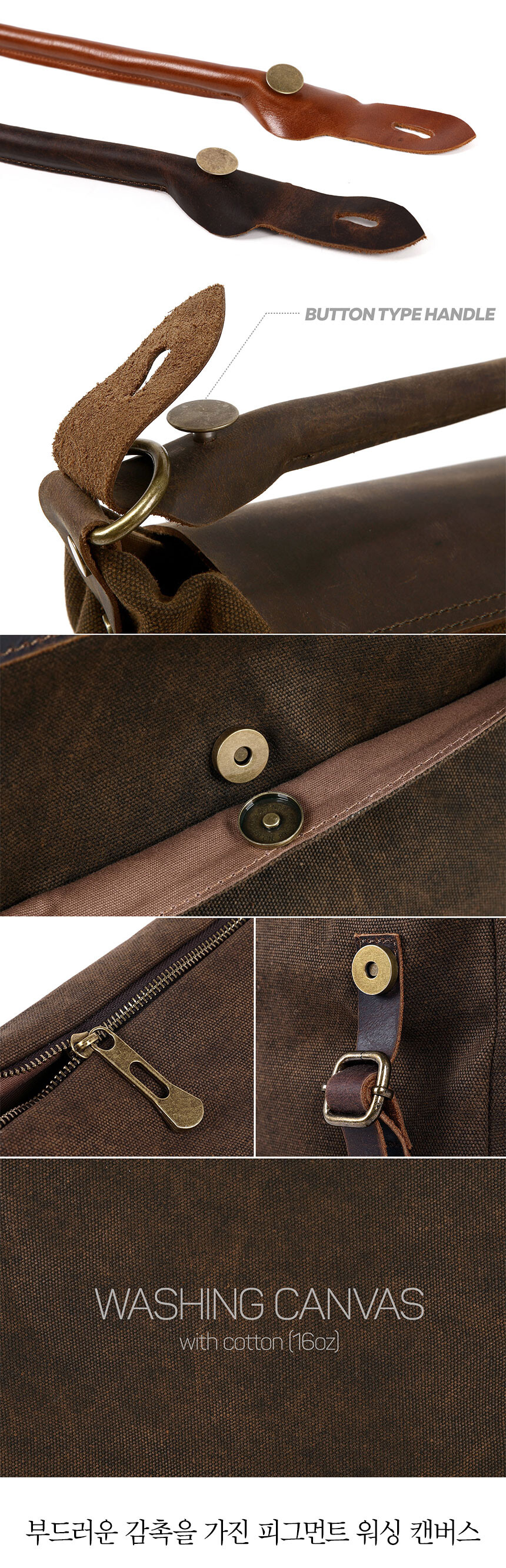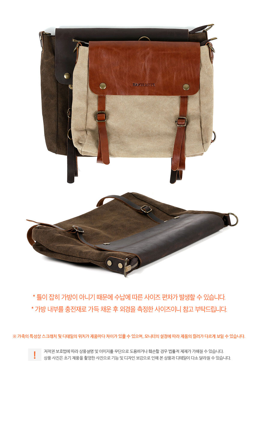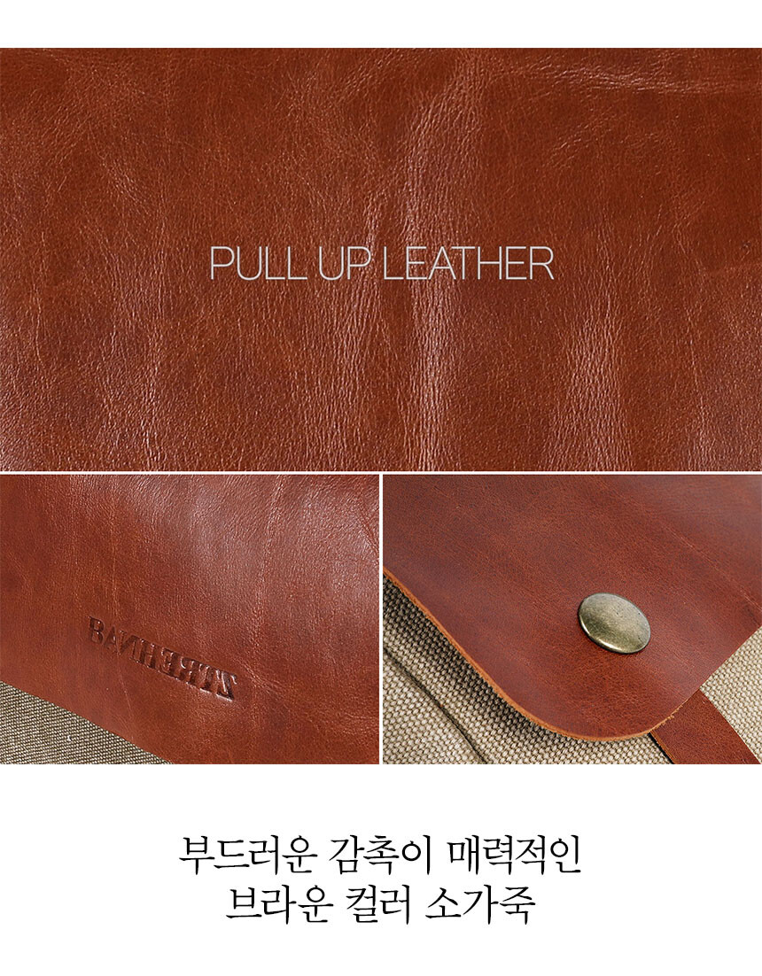 외피: 워싱 캔버스 | 내피: 코튼 | 덮개/핸들: 소가죽 | 커버: 소가죽 | 부자재: 메탈
