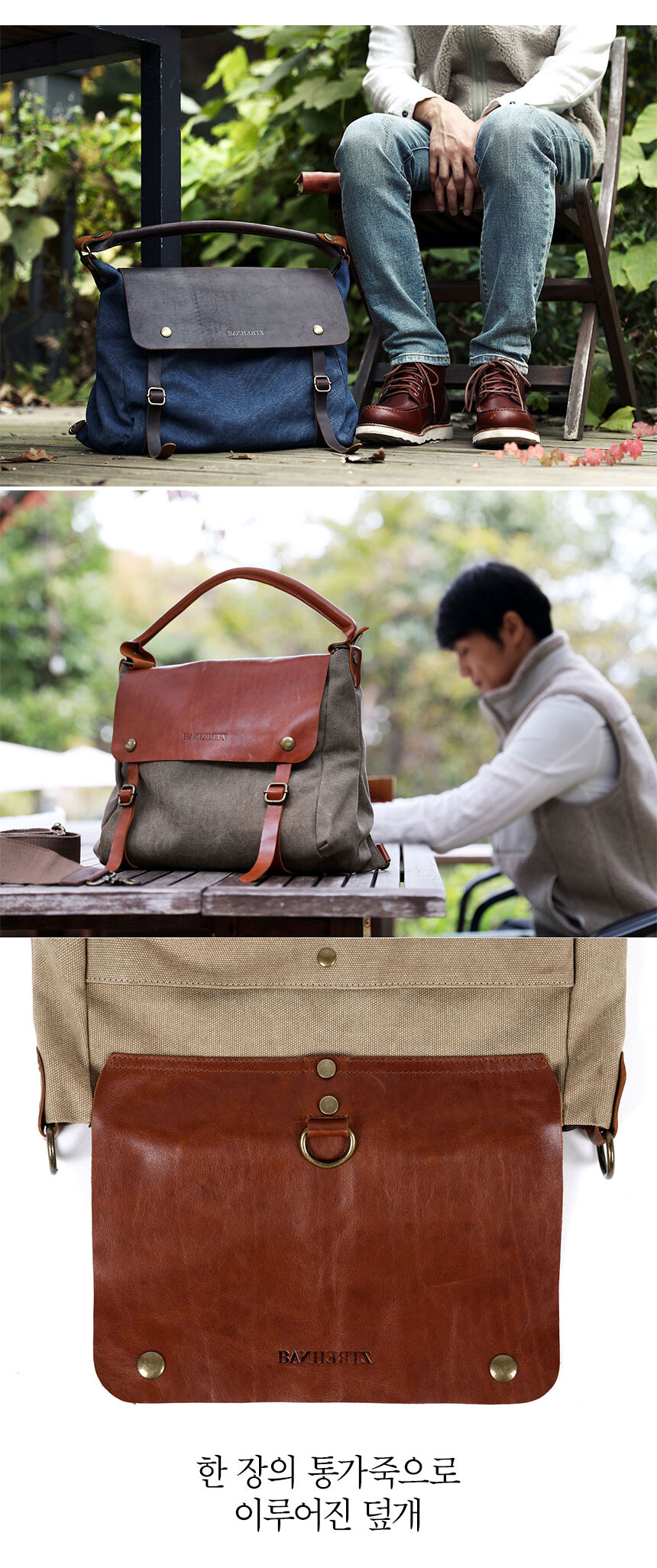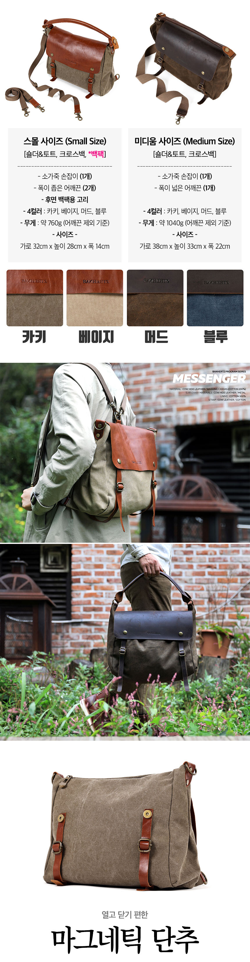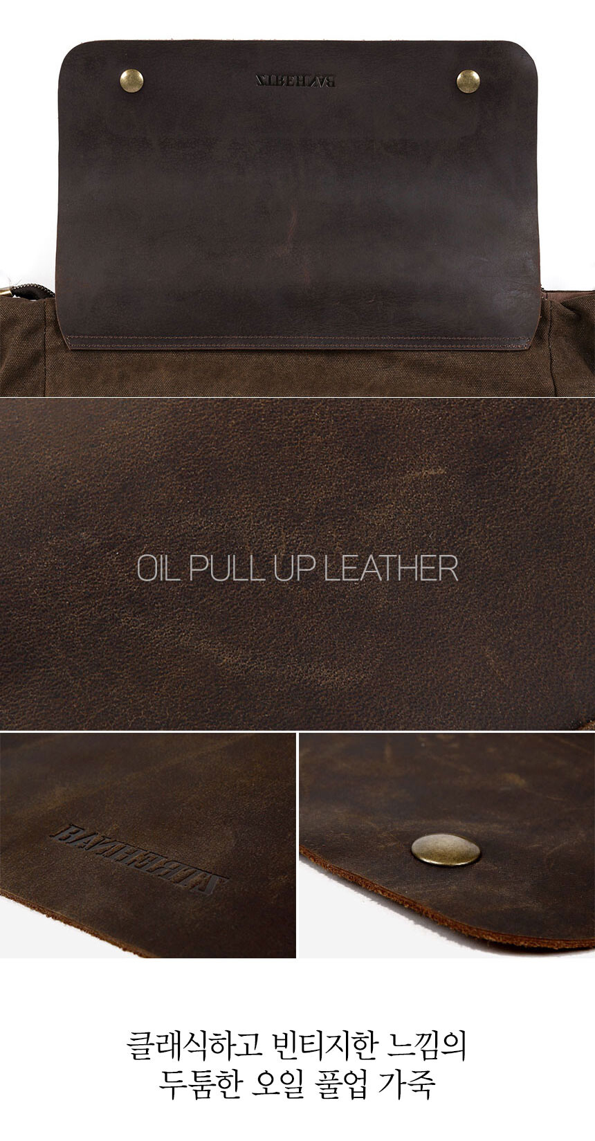 외피: 워싱 캔버스 | 내피: 코튼 | 덮개/핸들: 소가죽 | 커버: 소가죽 | 부자재: 메탈