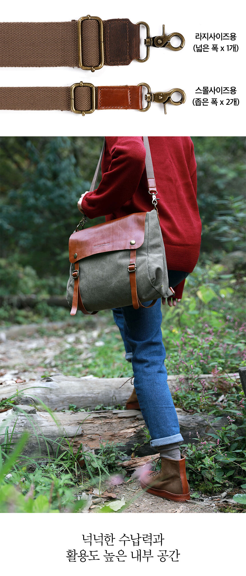 제공되는 어깨끈은 나일론 재질이 아닌 두툼한 면웨빙으로 착용감이 뛰어나고, 숄더 또는 크로스로 사용 시 미끄러짐이 적어 가방이 쉽게 흘러내리는 것을 방지해줍니다.