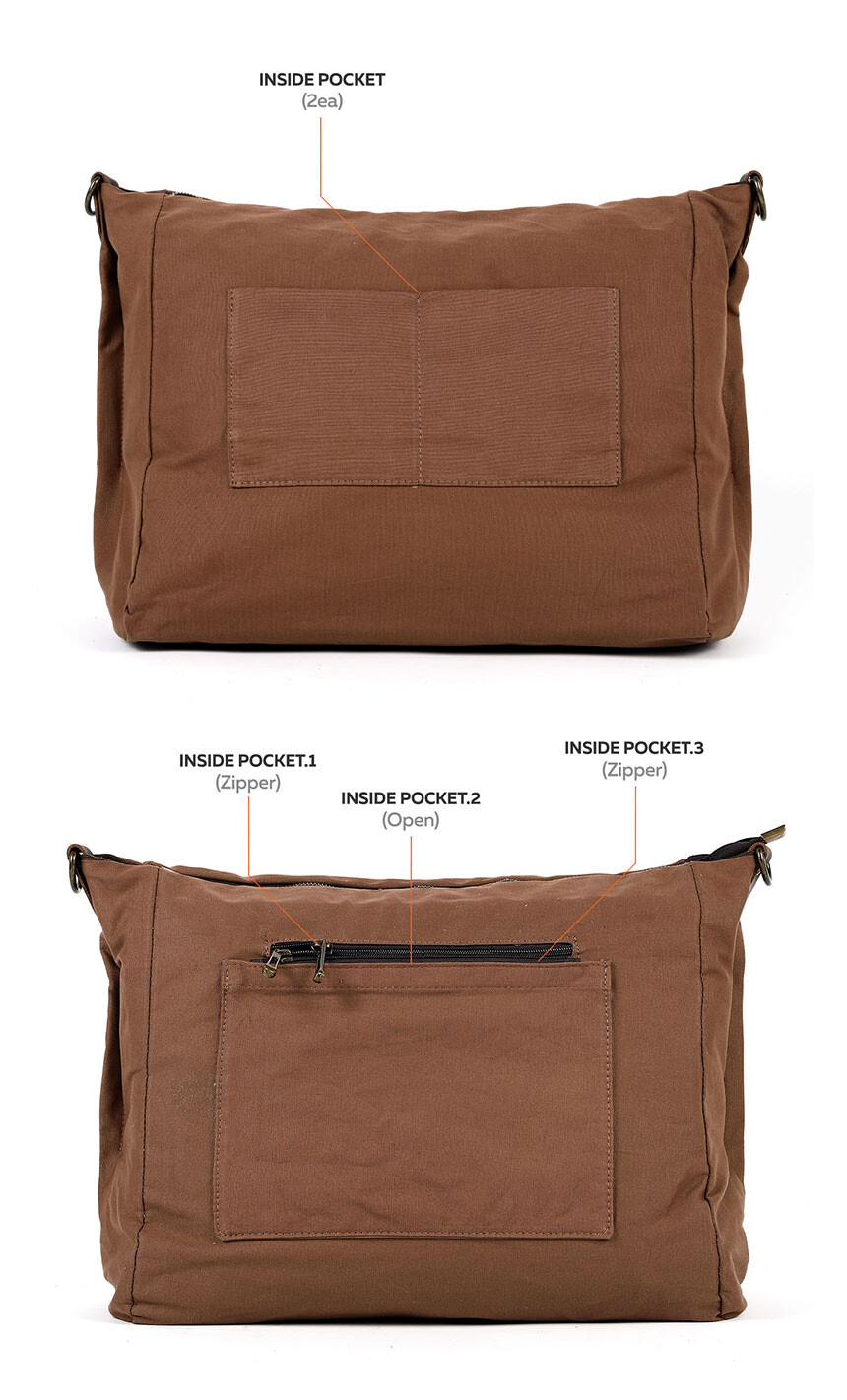 소가죽과 함께 메인 소재로 사용된 캔버스 원단은 16oz의 두툼한 두께로 천연 염색 기법인 피그먼트 워싱을 통해 완성되었습니다. 루즈하고 빈티지한 가방의 컨셉에 맞게 진행한 피그먼트 워싱은 친환경 안료(피그먼트)로 장시간 삶아 섬유소 내부의 불순물과 이물질을 제거하고, 부드러운 터치감과 고급스러운 색감을 표현하기에 적합한 가공법입니다.