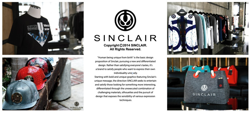 ABOUT SINCLAIR SINCLAIR는 2014년 런칭된 디자이너 브랜드로 디자인을 통해서 자신만의 길을 가는 순수미술, 스트릿, 힙합, ROCK, Third Culture 문화를 즐기는 각계 각층의 모든 이들과 공감. 소통하고자 하는 것이 SINCLAIR의 MOTO입니다. "UNDERGROUND LUXURY" 라는 메인 THEME 아래 “UNIQUE & DIFFERENT”를 보여줄 수 있는 디자인을 매시즌 다양한 주제를 바탕으로 의류, 모자, 가방, 기타 악세서리의 아이템으로 풀어내는 LUXURY BRAND를 지향합니다. 모든 이의 취향을 만족시키기 보다는 자신만의 개성을 독특하게 표현하고자 하는 사람들을 만족시키기 위한 브랜드입니다. 싱클레어 특유의 메세지를 담은 과감하면서도 독특한 그래픽으로 시작하여, 시도되지 않은 도전적인 소재의 조합과 실루엣, 다양한 표현 기법디자이너의 감성을 잘 드러내는 디자인의 추구를 통해서 좀더 재미있는, 차별화된 것을 찾는 사람들에게 즐거움을 주고 그들을 만족시키는 것이 SINCLAIR가 추구하는 방향입니다