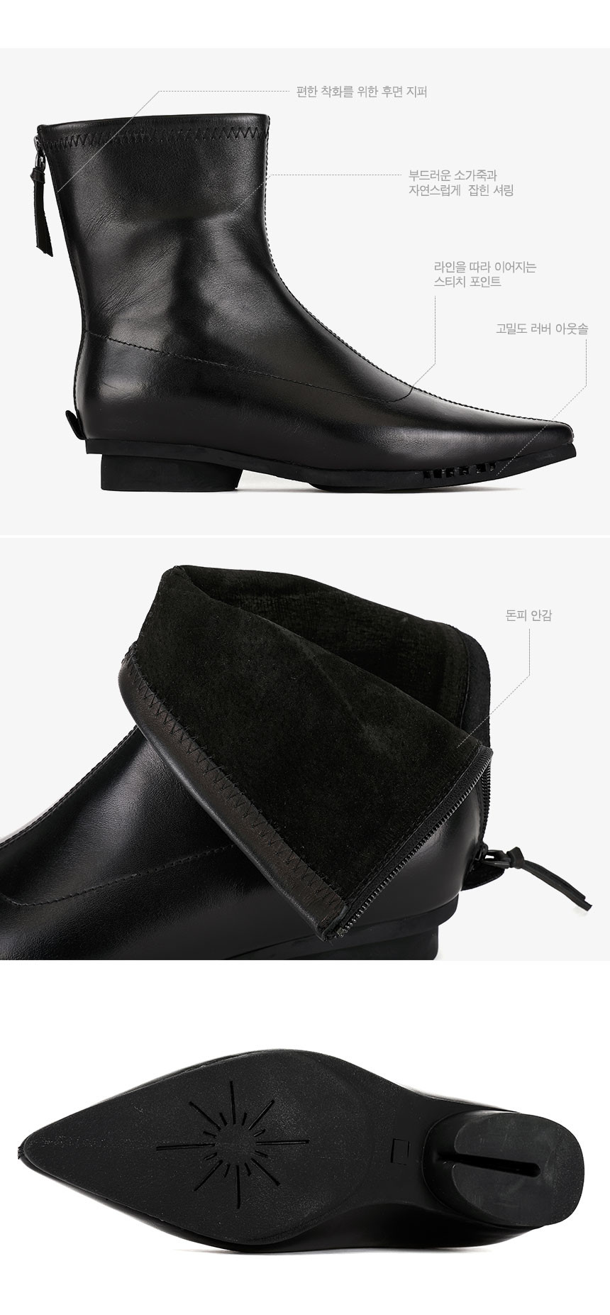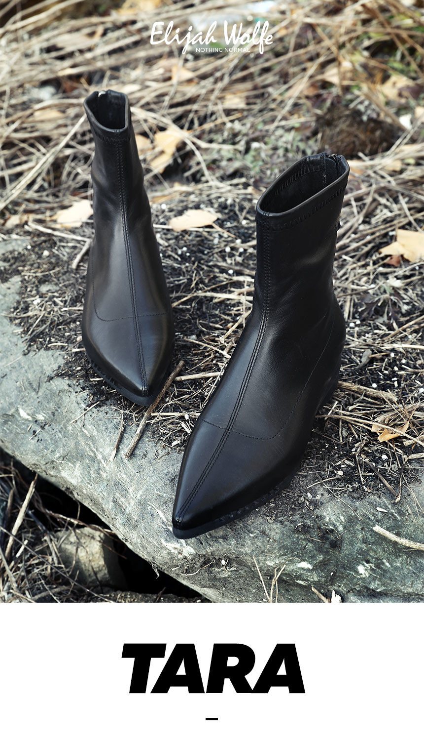 독특하고 날렵한 앞코를 따라 이어지는 스티치로 포인트를 살린 여성용 부츠, 타라(TARA). 고밀도 러버 아웃솔과 라텍스 깔창으로 폭신한 착화감을 느낄 수 있으며 은은한 광택이 감도는 소가죽과 지퍼로 착화가 편한 여성슈즈입니다.