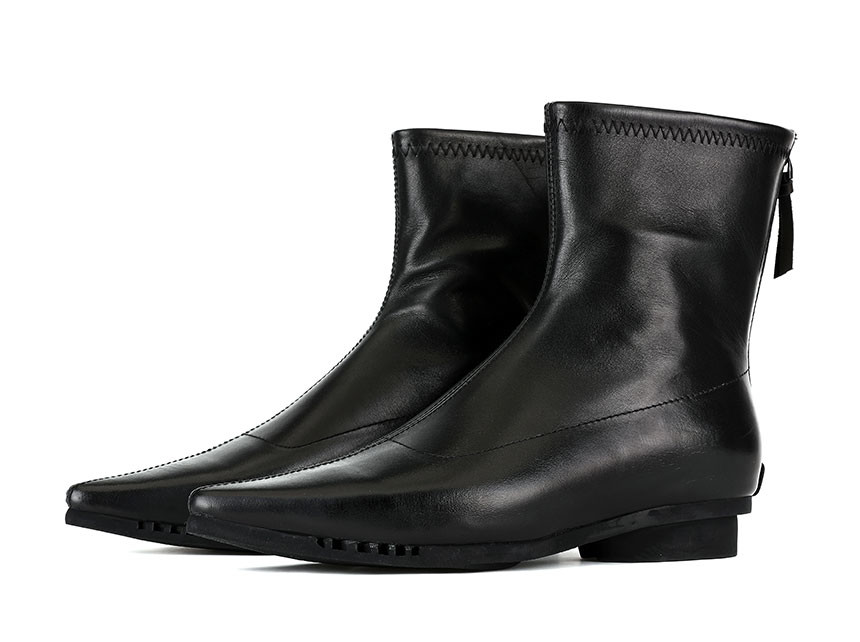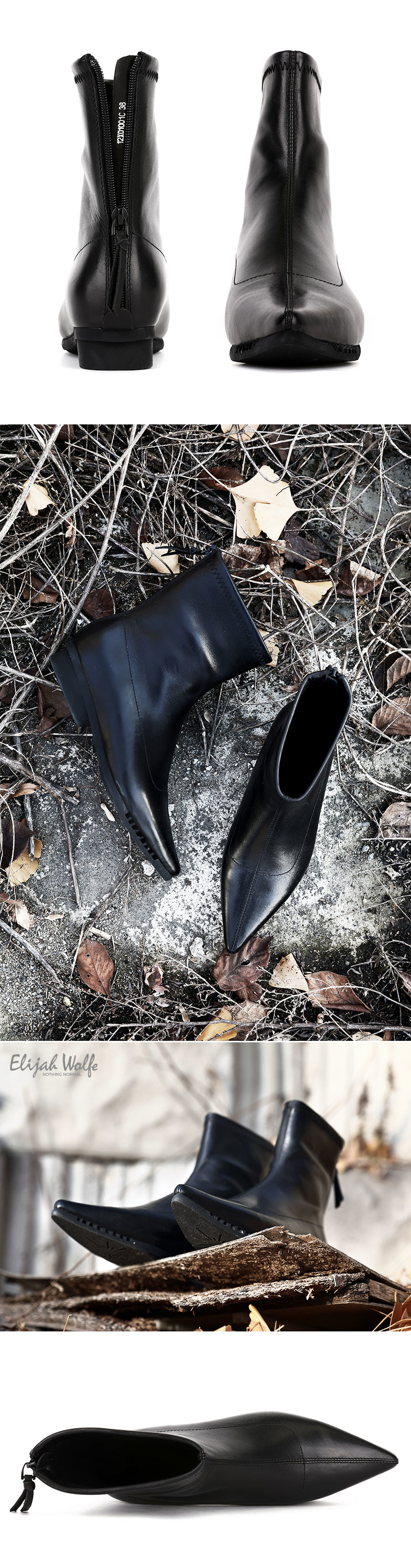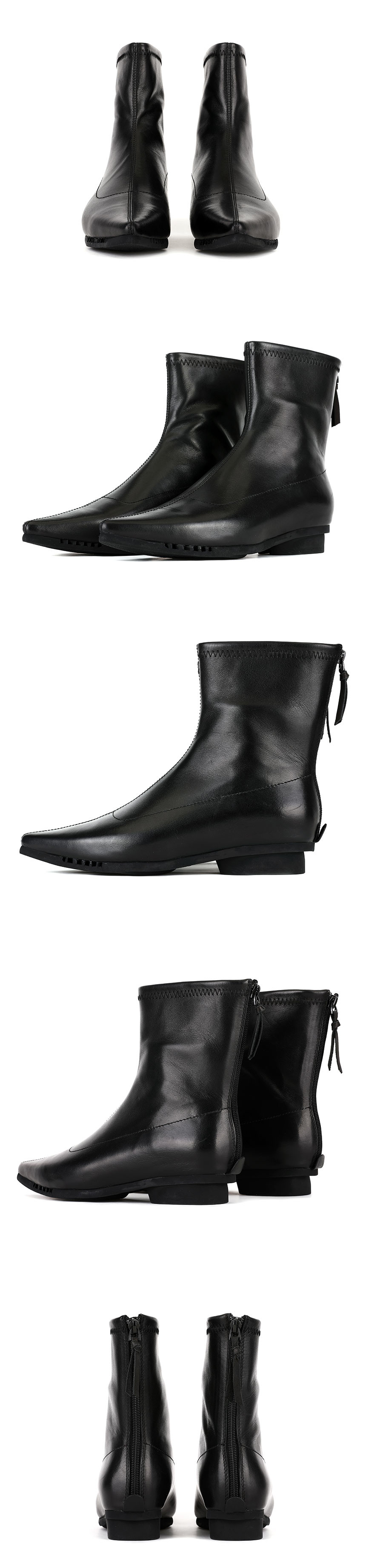 기본적으로 착화가 편한 입구가 넓은 부츠타입이지만, 뒤꿈치 쪽으로 지퍼를 달아두었기 때문에 한결 더 편하게 신고 벗을 수 있습니다. 앞코부터 발목까지 이어지는 스티치는 자칫 단조로울 수 있는 디자인에 포인트가 되어주죠.