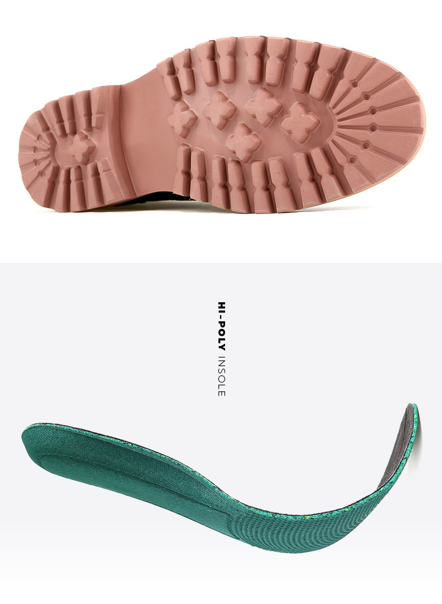 발포한 고밀도 재생면을 사용한 하이폴리 소재는 장시간 착용에도 처음같은 쿠션감이 유지되어 피로를 덜어주며, 우수한 습도유지와 통기성으로 쾌적함을 느낄 수 있습니다.